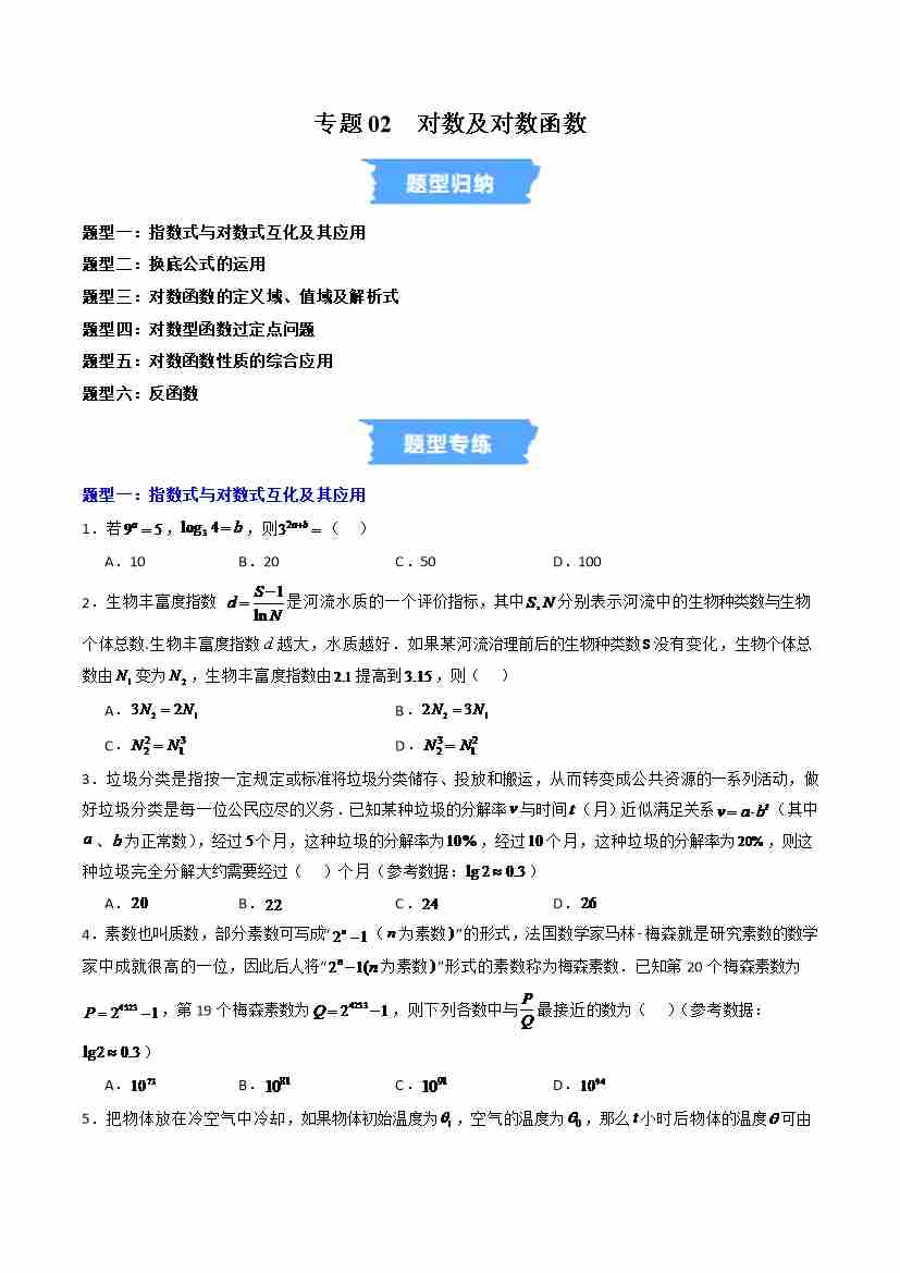专题02 对数及对数函数的六大常考题型(高效培优专项训练)(学生版)