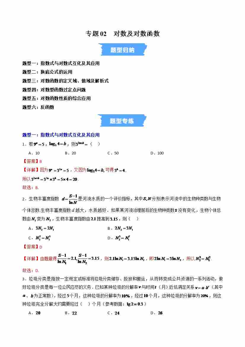 专题02 对数及对数函数的六大常考题型(高效培优专项训练)(教师版)