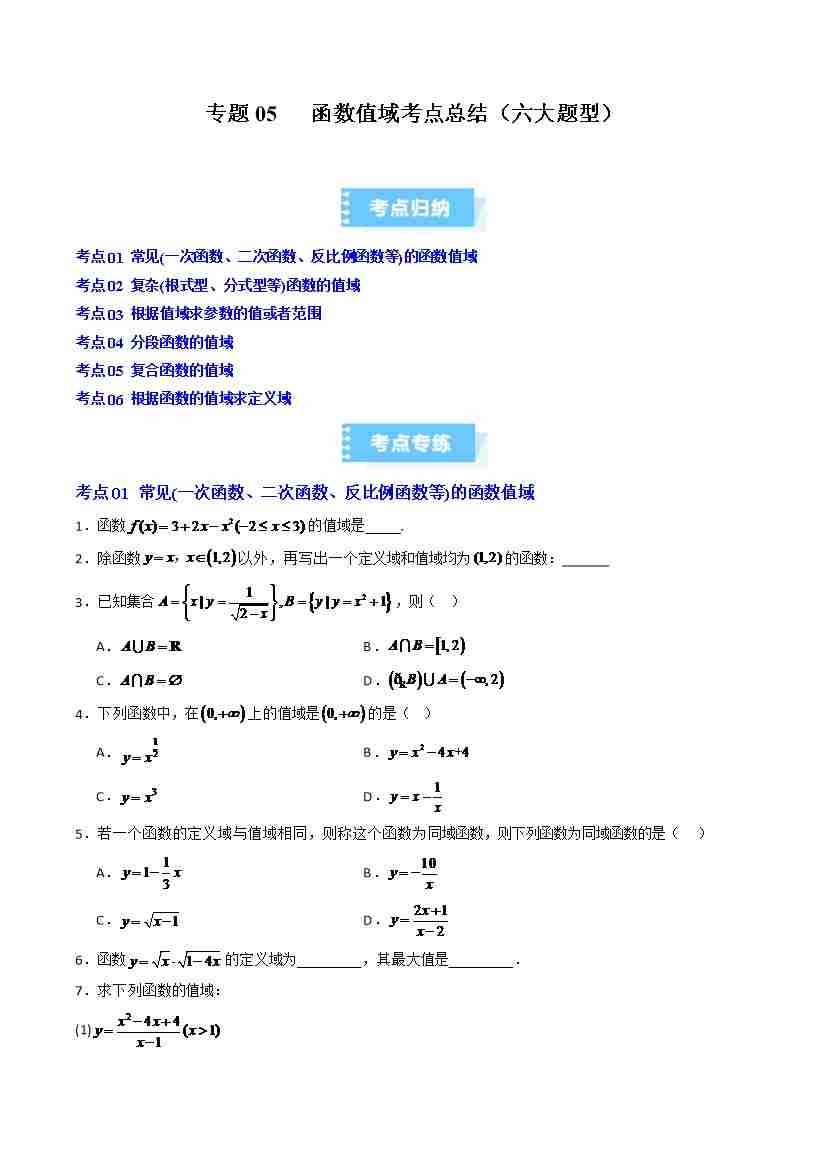 专题05 函数值域考点总结(六大题型)(高效培优期中专项训练)(学生版)