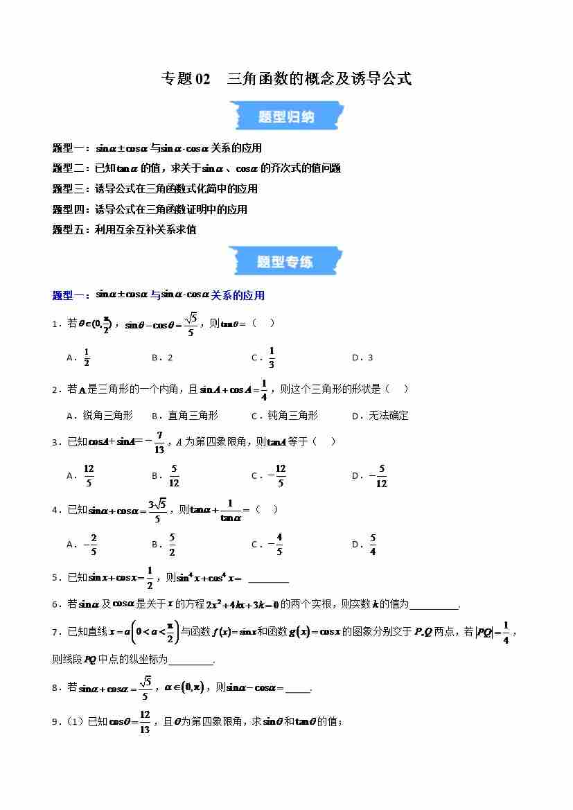 专题02 三角函数的概念及诱导公式的五大常考题型(高效培优专项训练)(学生版)