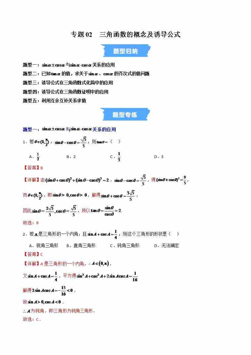 专题02 三角函数的概念及诱导公式的五大常考题型(高效培优专项训练)(教师版)