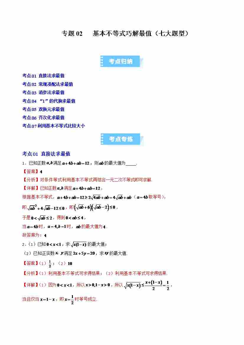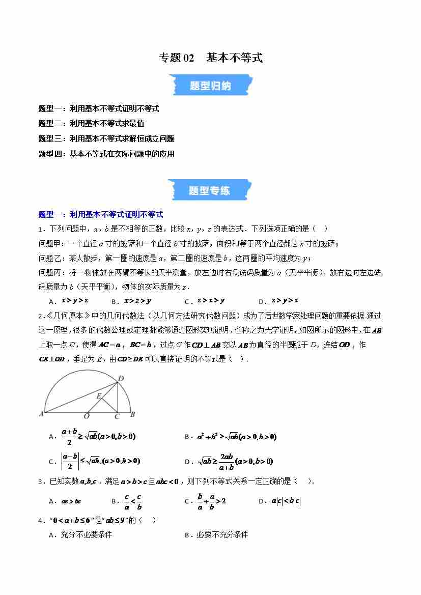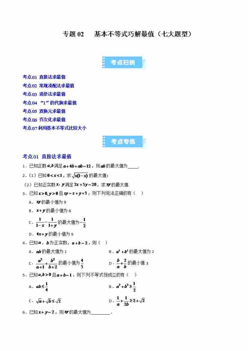 专题02 基本不等式的四大常考题型(高效培优专项训练)(学生版)
