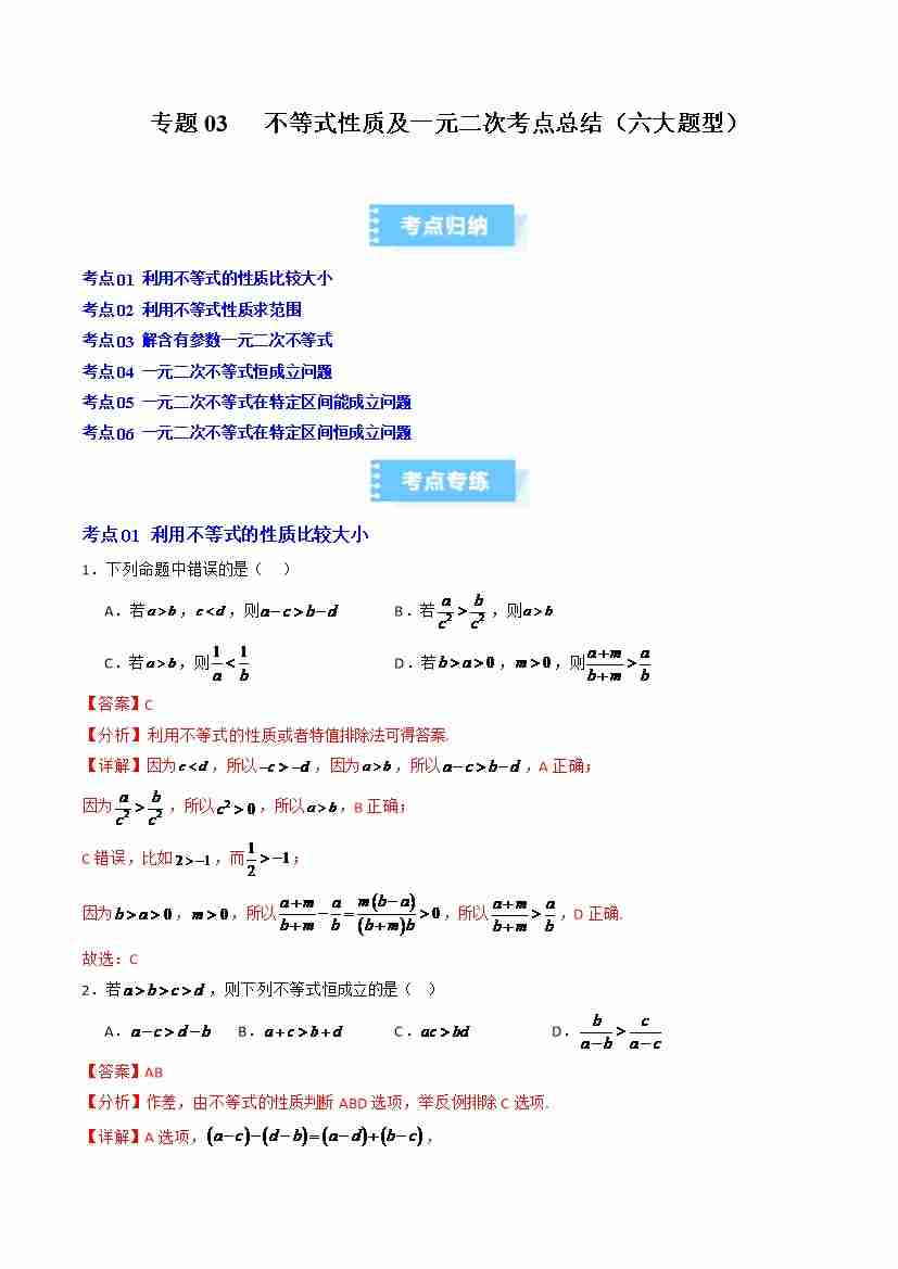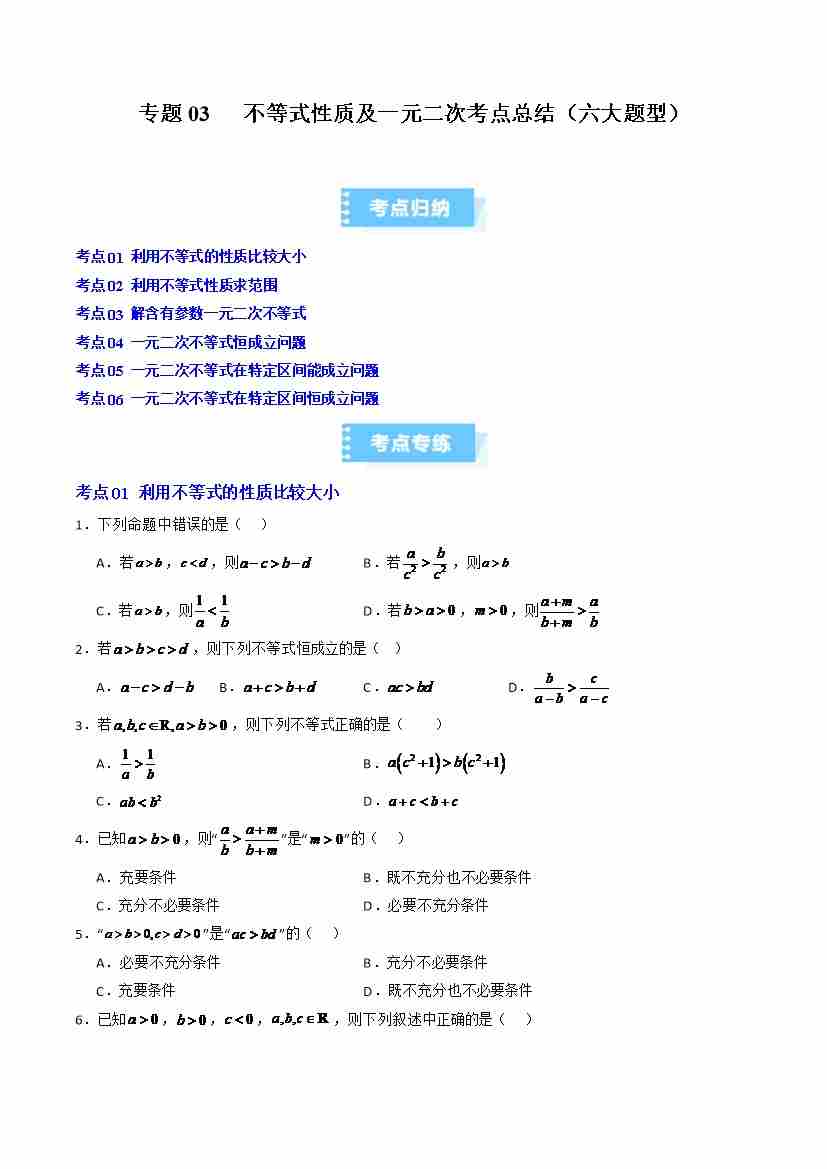 专题03 不等式性质及一元二次考点总结(六大题型)(高效培优期中专项训练)(教师版)