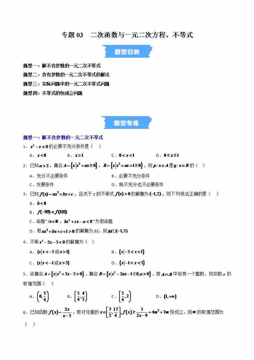 专题03 二次函数与一元二次方程、不等式的四大常考题型(高效培优专项训练)(学生版)
