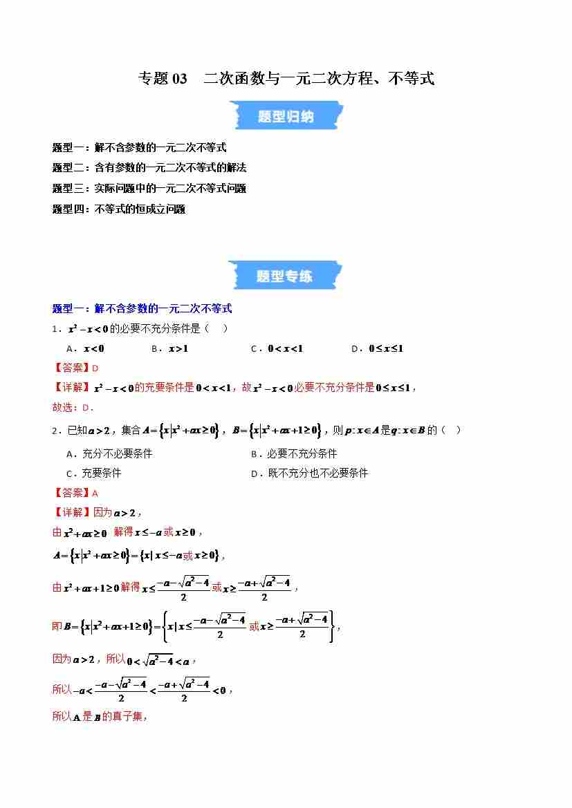 专题03 二次函数与一元二次方程、不等式的四大常考题型(高效培优专项训练)(教师版)