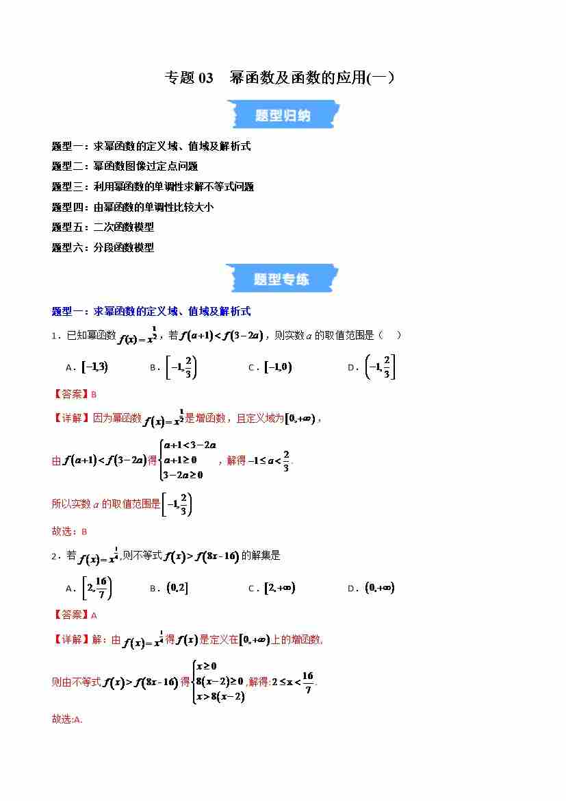 专题03 幂函数及函数的应用(一)的六大常考题型(高效培优专项训练)(教师版)