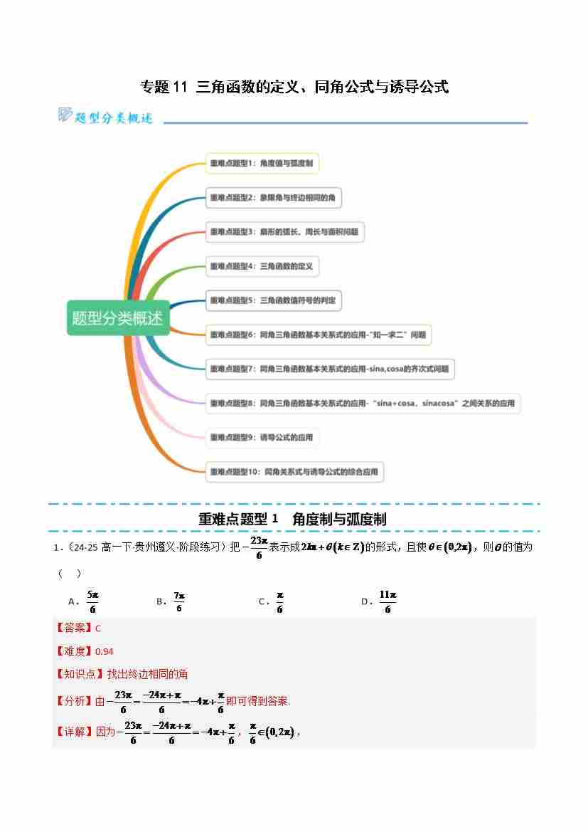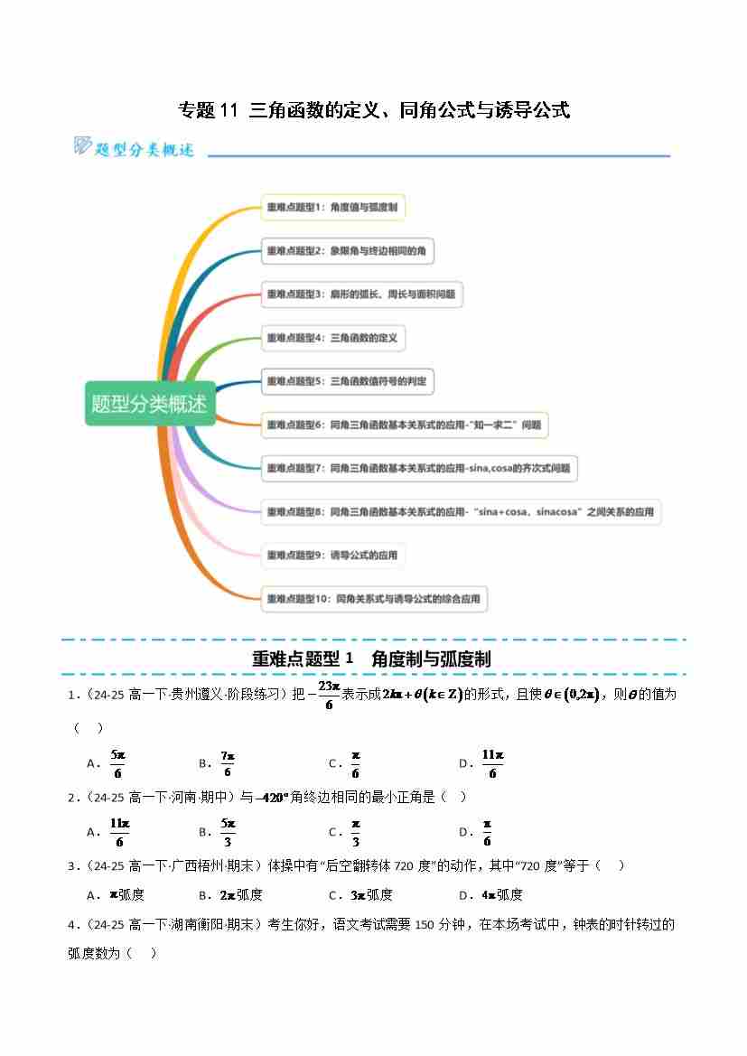 专题11 三角函数的定义、同角公式与诱导公式(十大题型精练)学生版