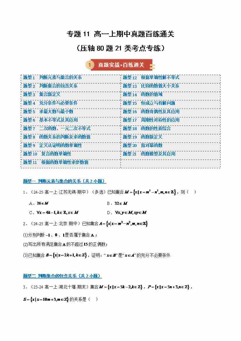 专题11 高一上期中真题百练通关(压轴80题21类考点专练)(期中专项训练)(学生版)