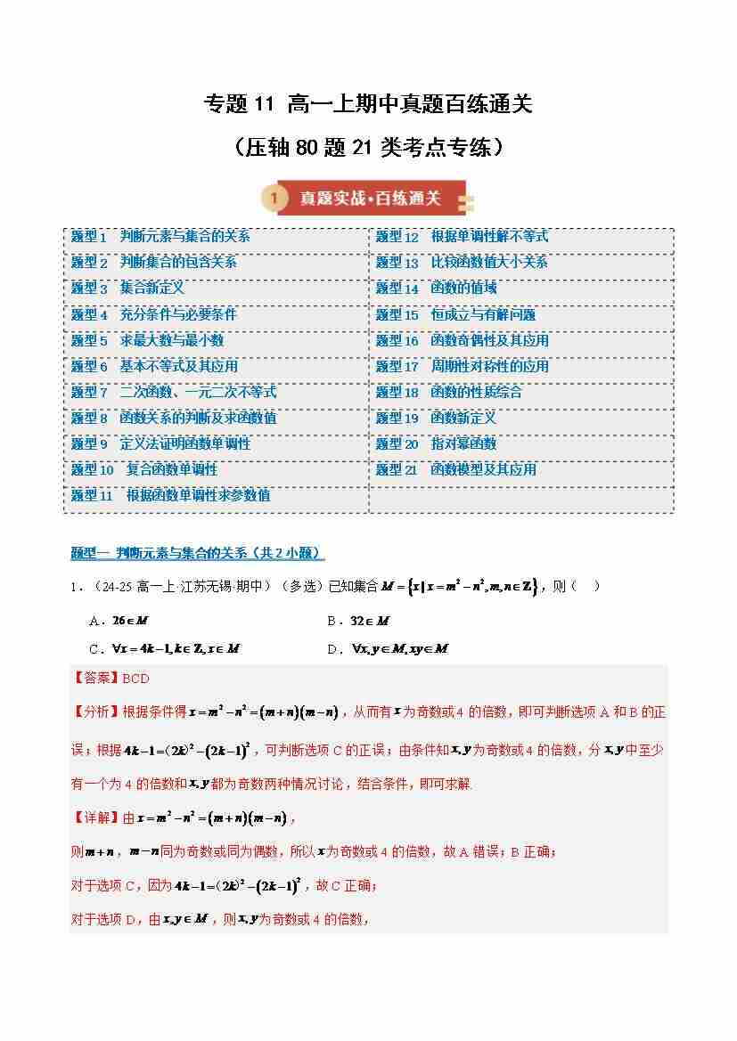 专题11 高一上期中真题百练通关(压轴80题21类考点专练)(期中专项训练)(教师版)