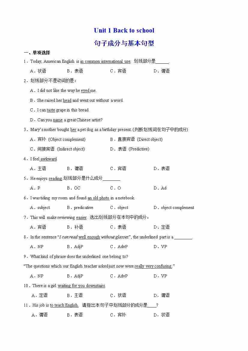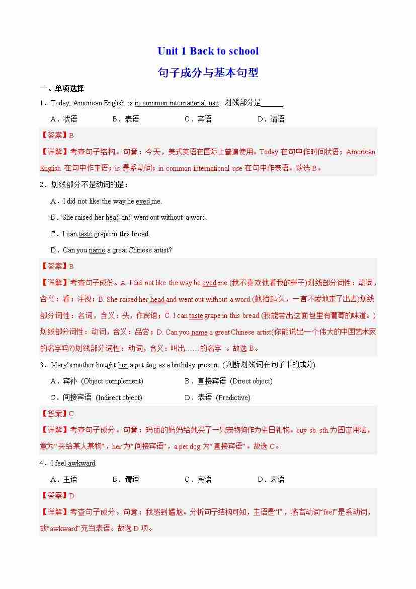 Unit 1 Back to school 语法Grammar 句子成分和基本句型(教师版)