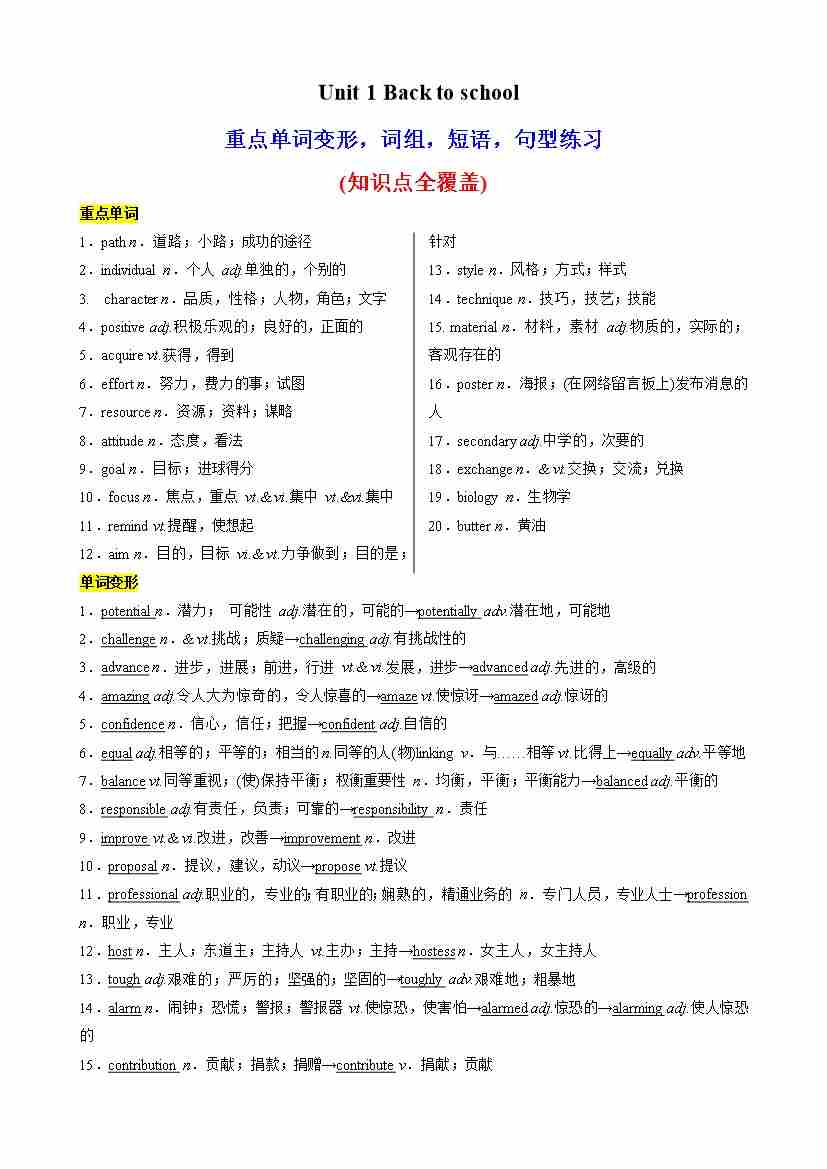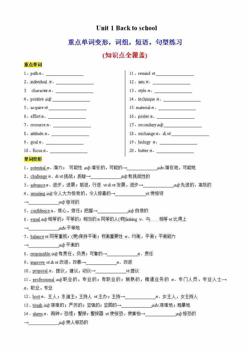 Unit 1 Back to school 重点单词变形,语法,词组,短语练习(学生版)