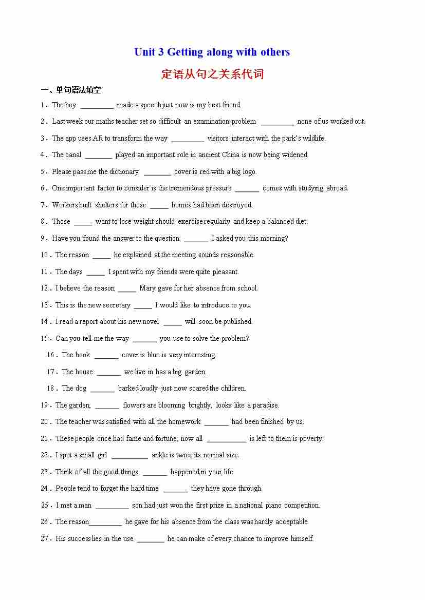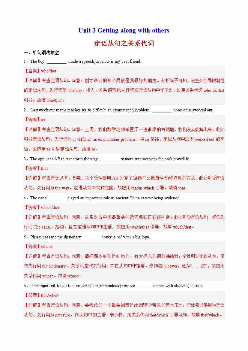 Unit 3 Getting along with others 语法Grammar 定语从句之关系代词(学生版)