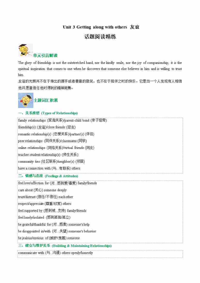 Unit 3 Getting along with others友谊(话题阅读精练)(学生版)