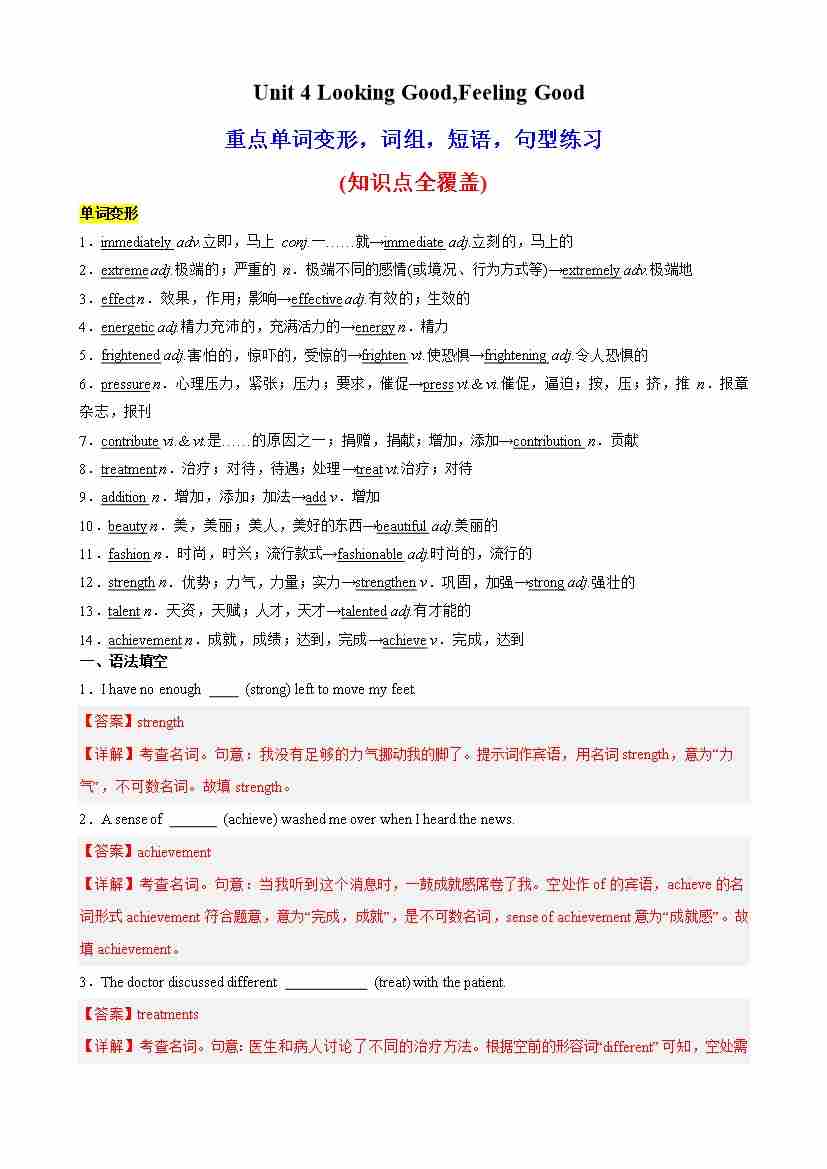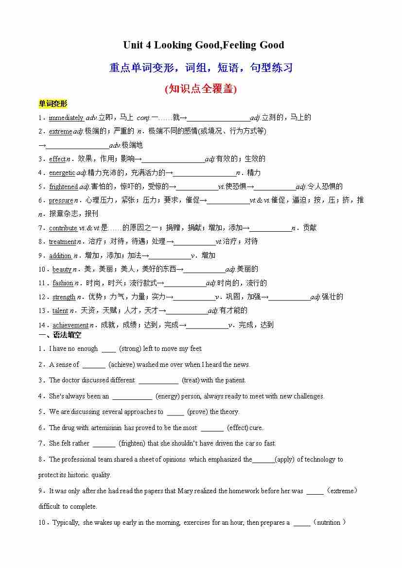Unit 4 Looking Good,Feeling Good重点单词变形,词汇,语法,知识点复习题(学生版)
