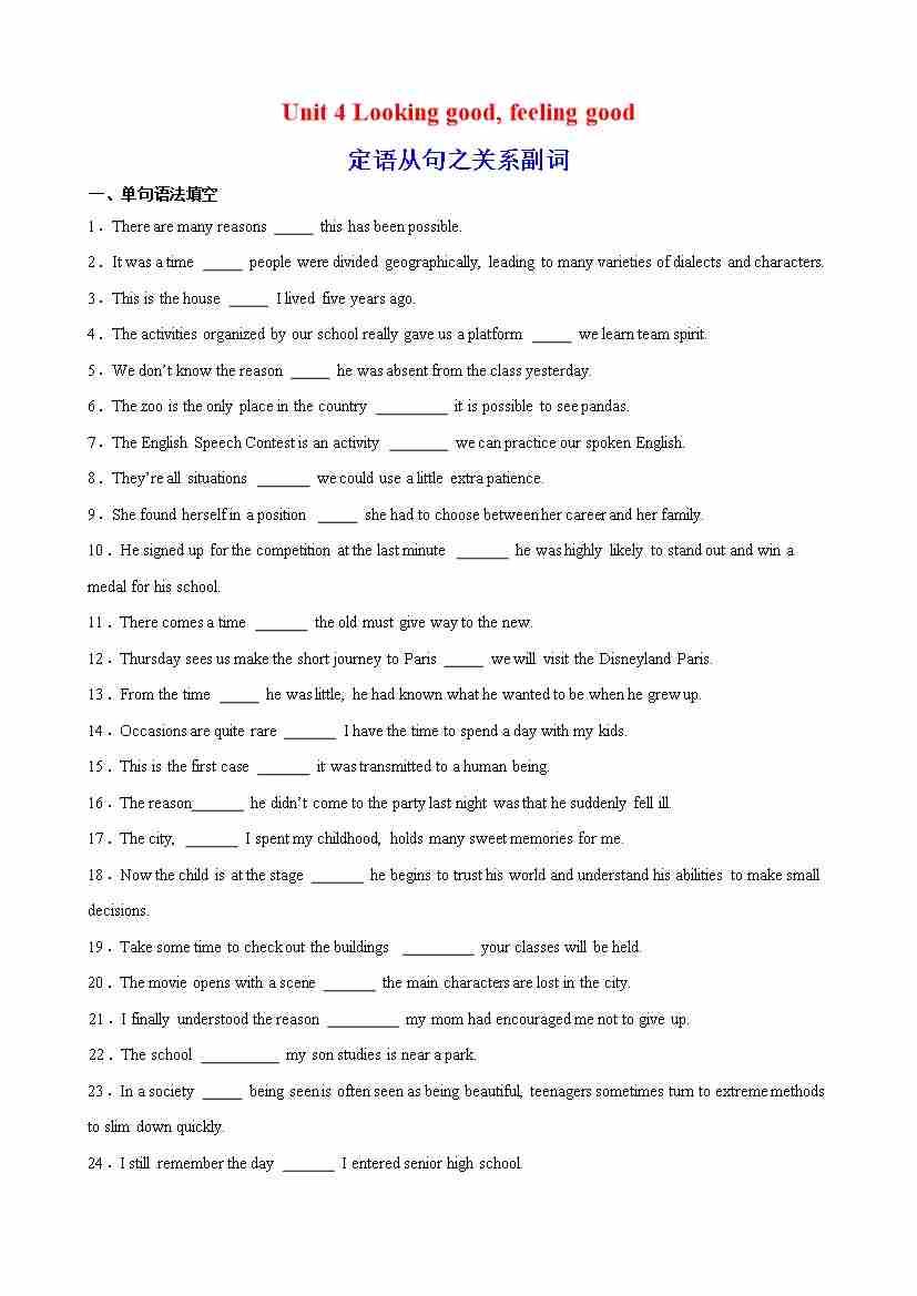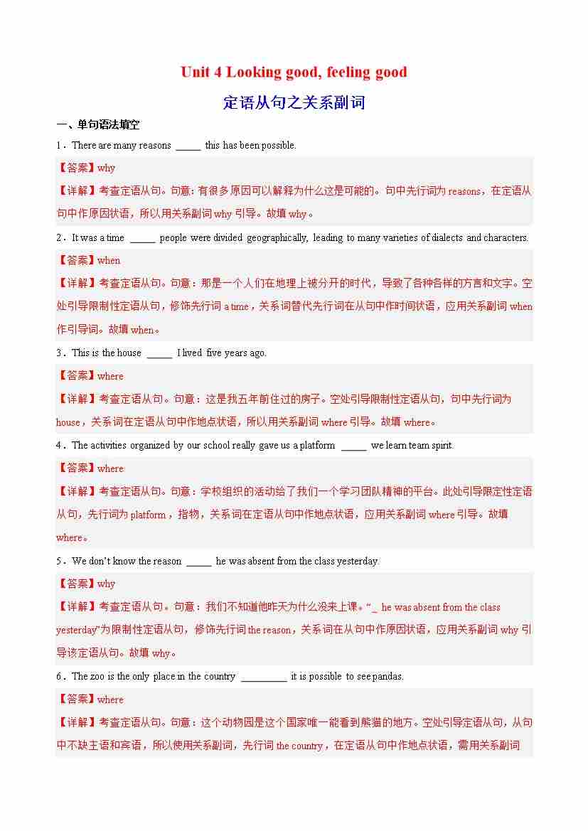 Unit 4 Looking good, feeling good 语法Grammar 定语从句之关系副词(学生版)