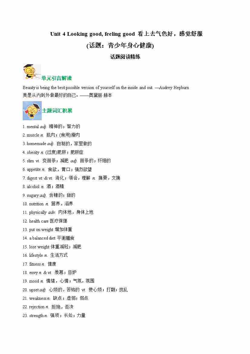 Unit 4 Looking good, feeling good 青少年身心健康(话题阅读精练)(学生版)