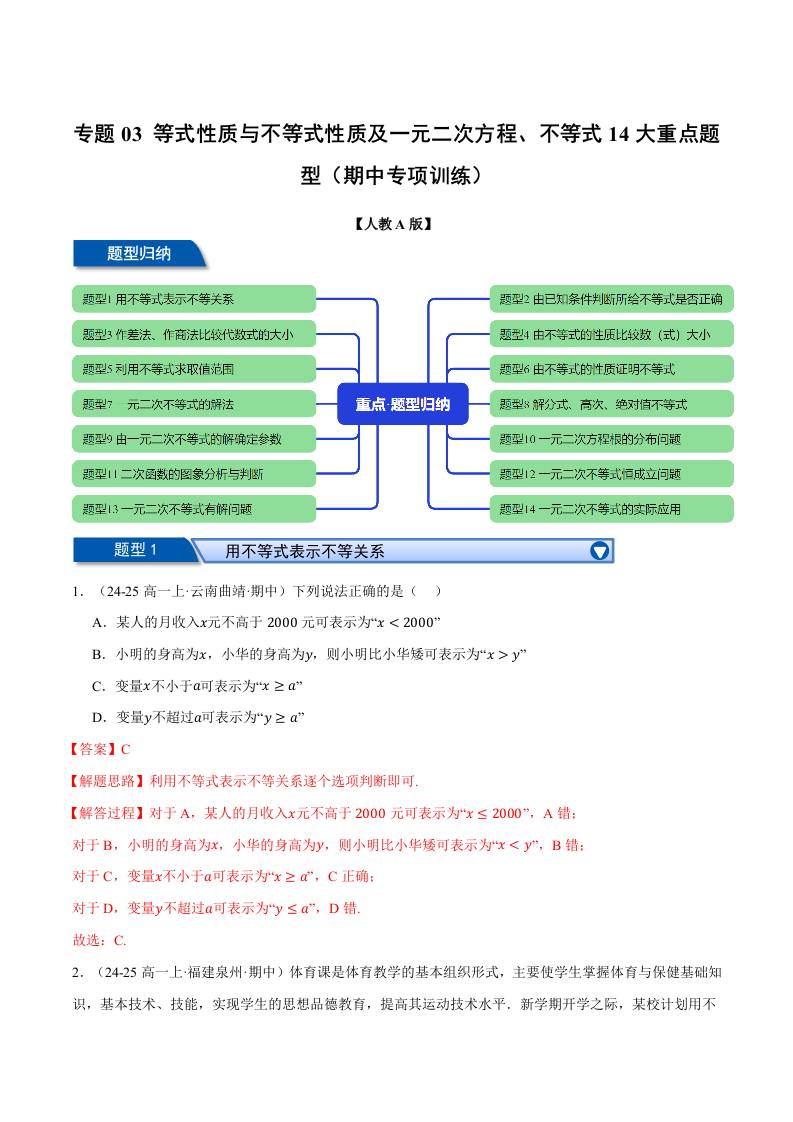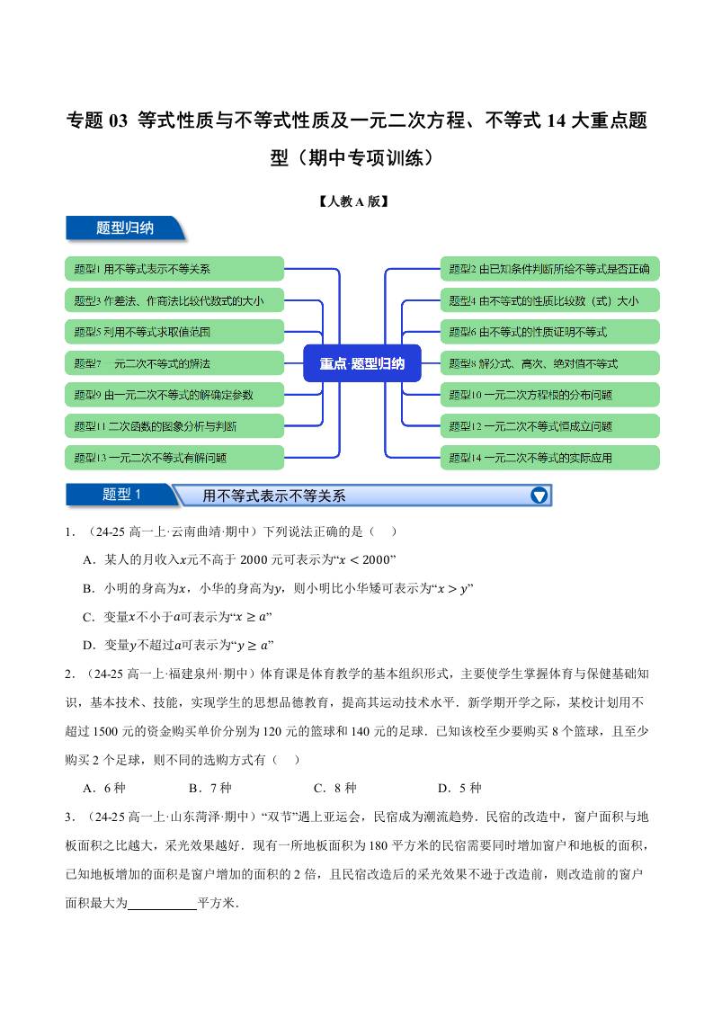 专题03 等式性质与不等式性质及一元二次方程、不等式14大重点题型(举一反三期中专项训练)(学生版)