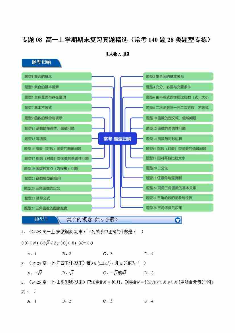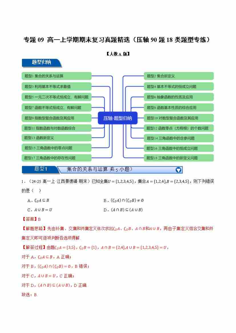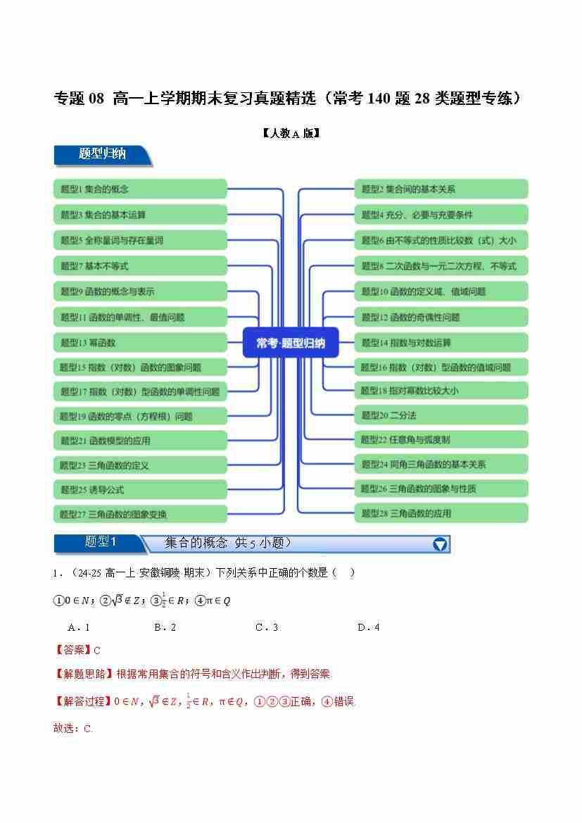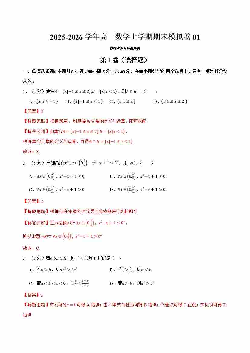 高一数学上学期期末模拟卷01(人教A版,举一反三)(测试范围:人教A版必修第一册)(解析版)