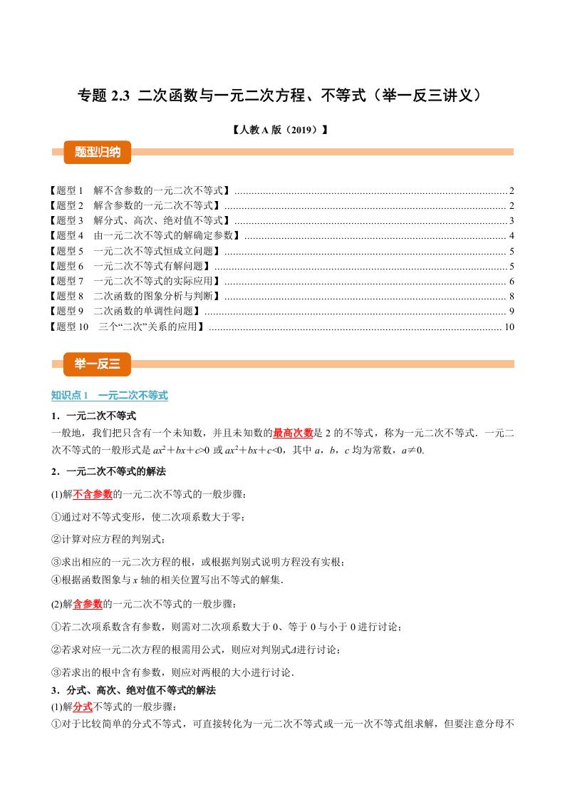 专题2.3 二次函数与一元二次方程、不等式(举一反三讲义)(学生版)