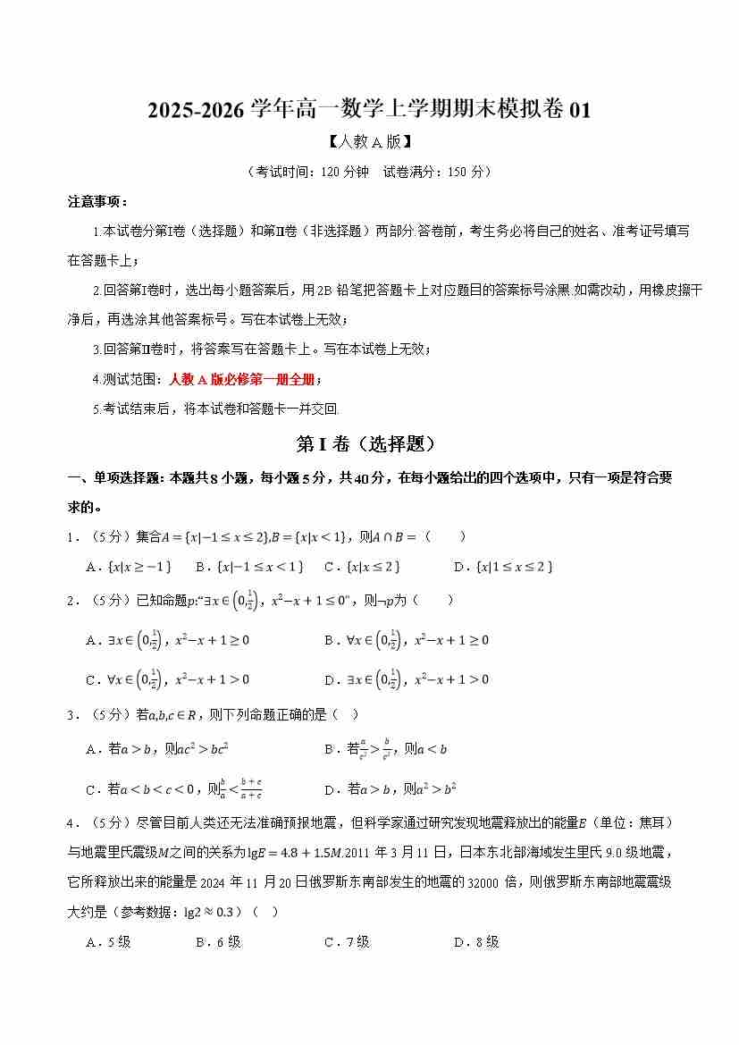 高一数学上学期期末模拟卷01(人教A版,举一反三)(测试范围:人教A版必修第一册)(原卷版)
