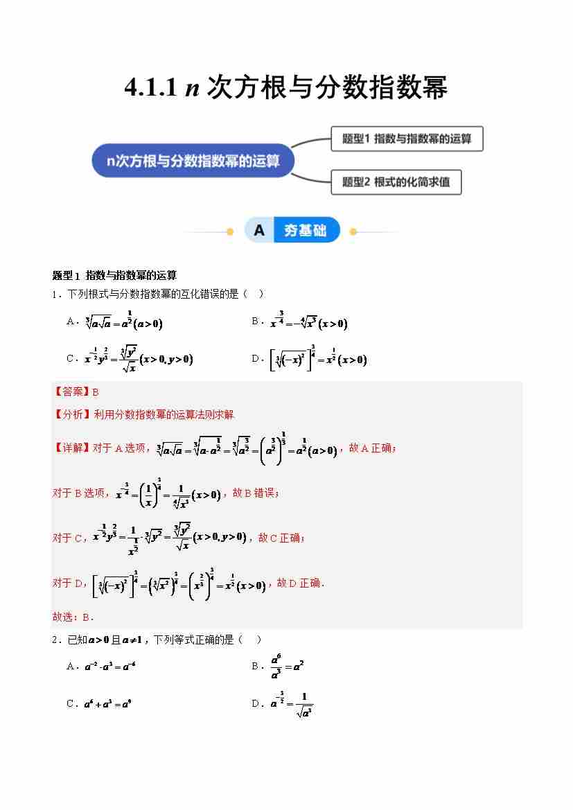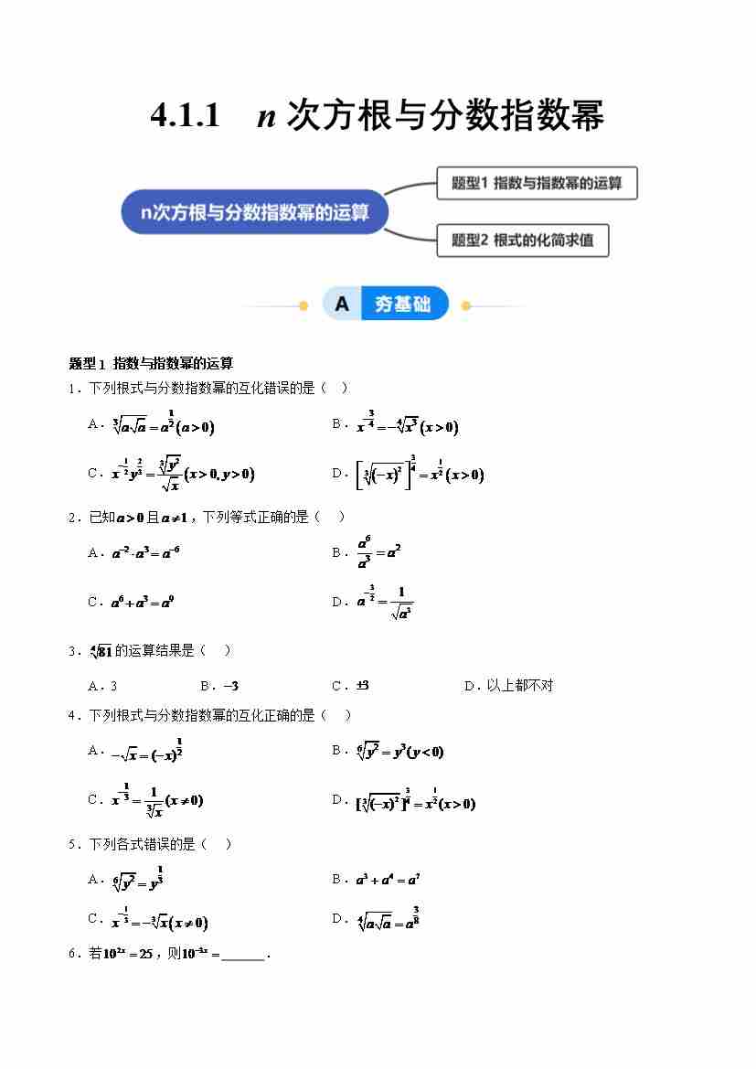 4.1.1 n次方根与分数指数幂(分层作业,2大题型)(原卷版)