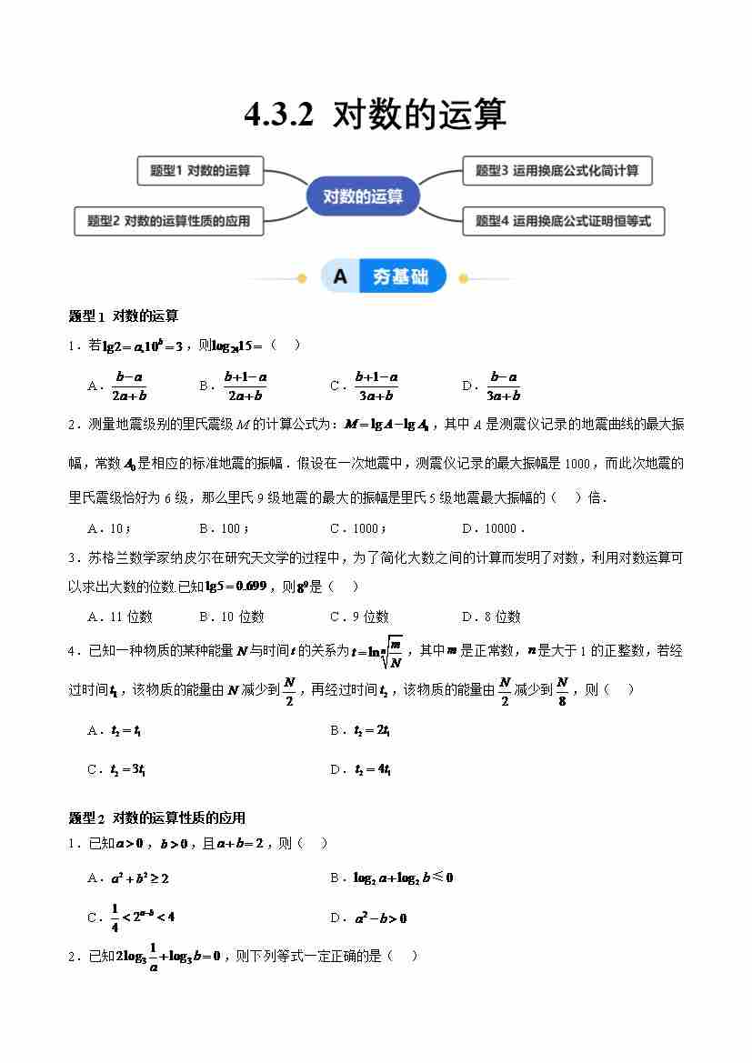 4.3.2 对数的运算(分层作业,4大题型)(原卷版)