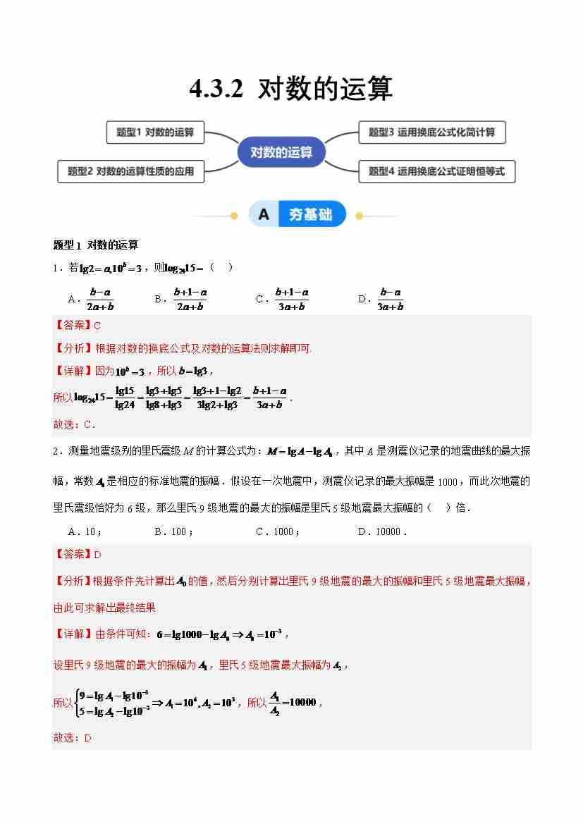 4.3.2 对数的运算(分层作业,4大题型)(解析版)