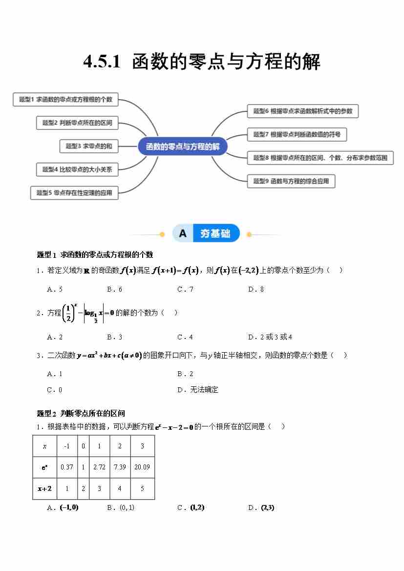 4.5.1 函数的零点与方程的解(分层作业,9大题型)(原卷版)