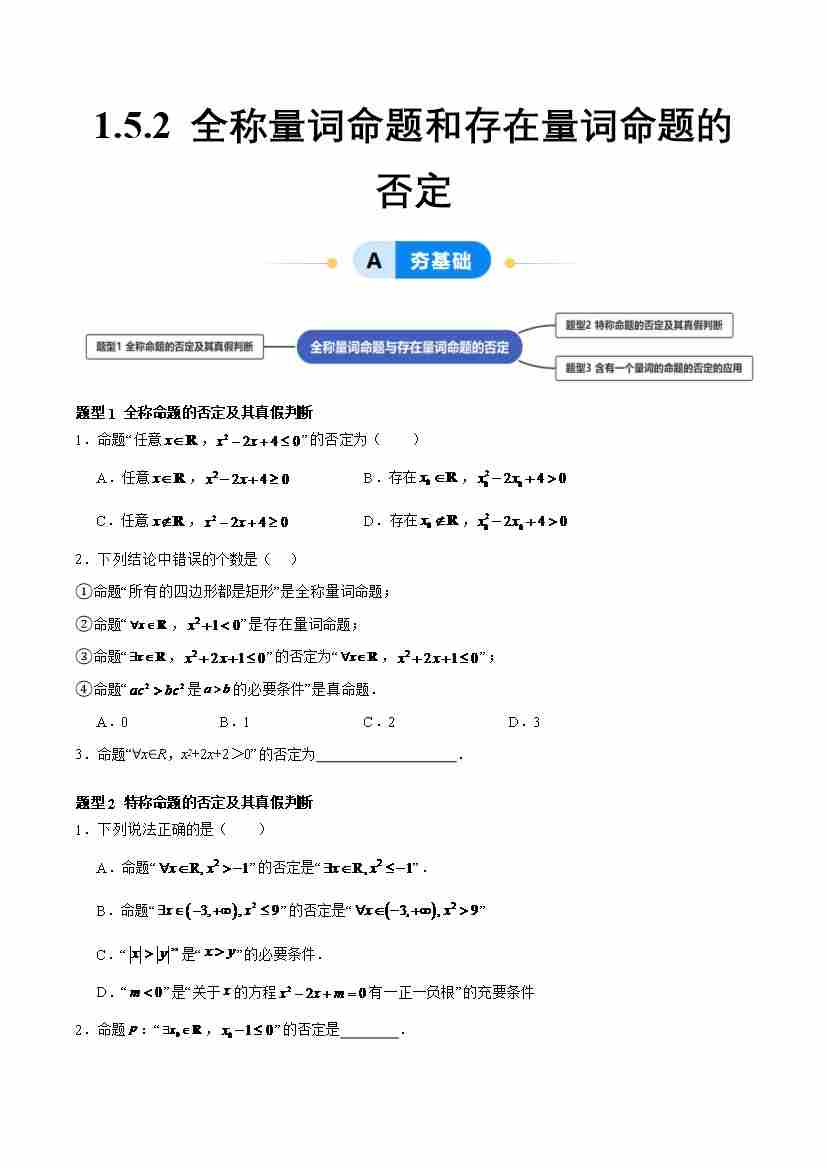 1.5.2 全称量词命题与存在量词命题的否定(分层作业, 3大题型)(原卷版)