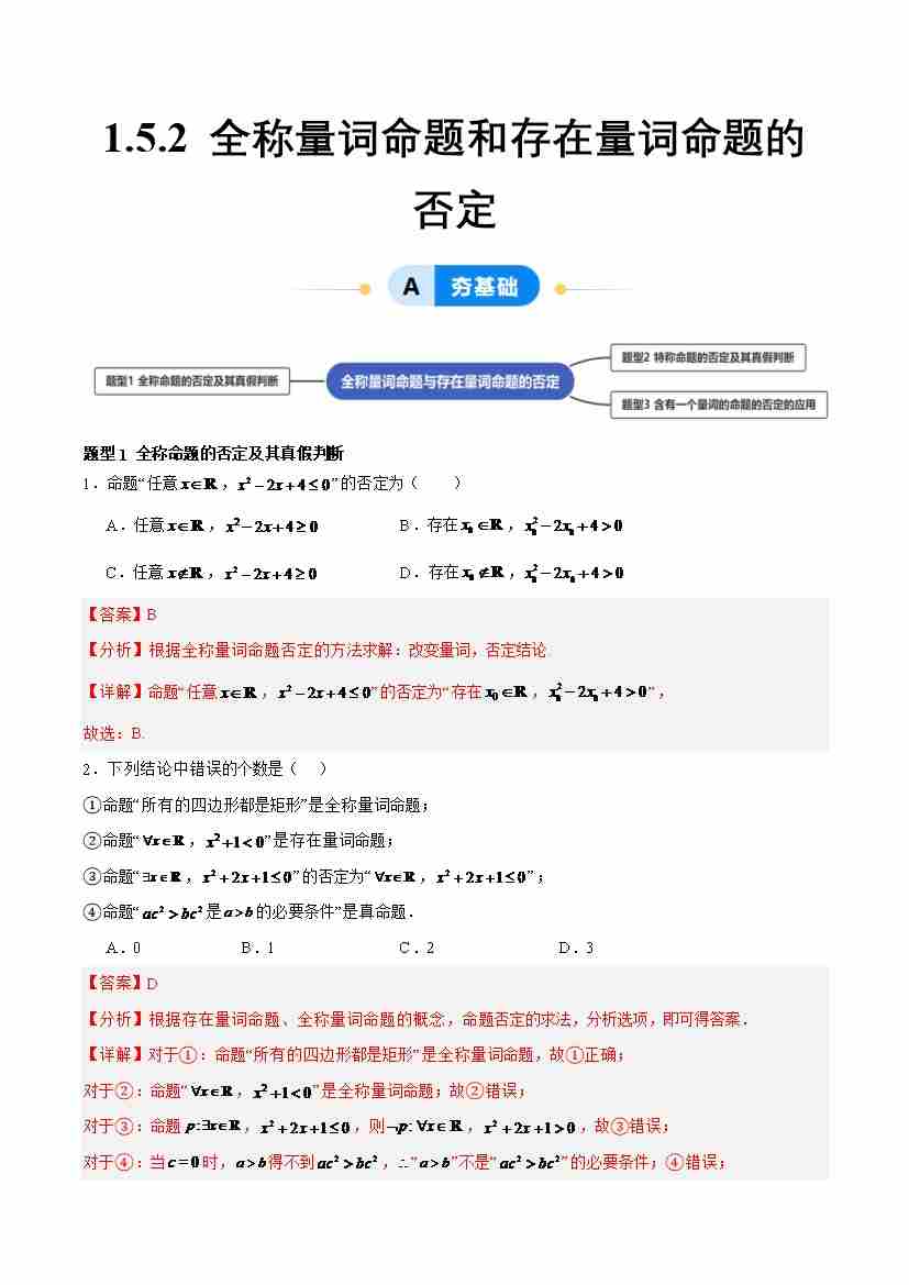 1.5.2 全称量词命题与存在量词命题的否定(分层作业, 3大题型)(解析版)