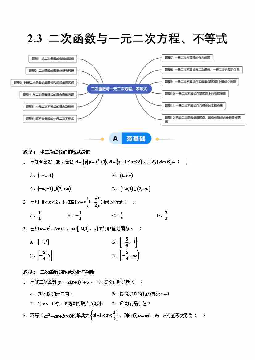2.3 二次函数与一元二次方程、不等式(分层作业,12大题型)(原卷版)