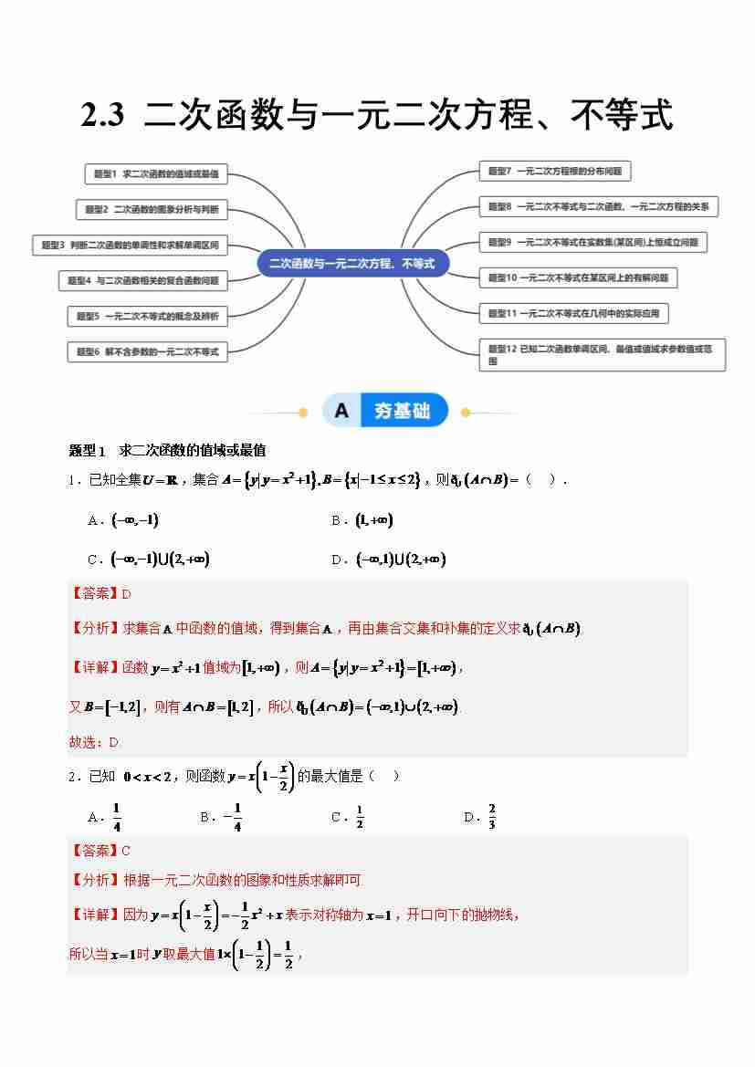 2.3 二次函数与一元二次方程、不等式(分层作业,12大题型)(解析版)