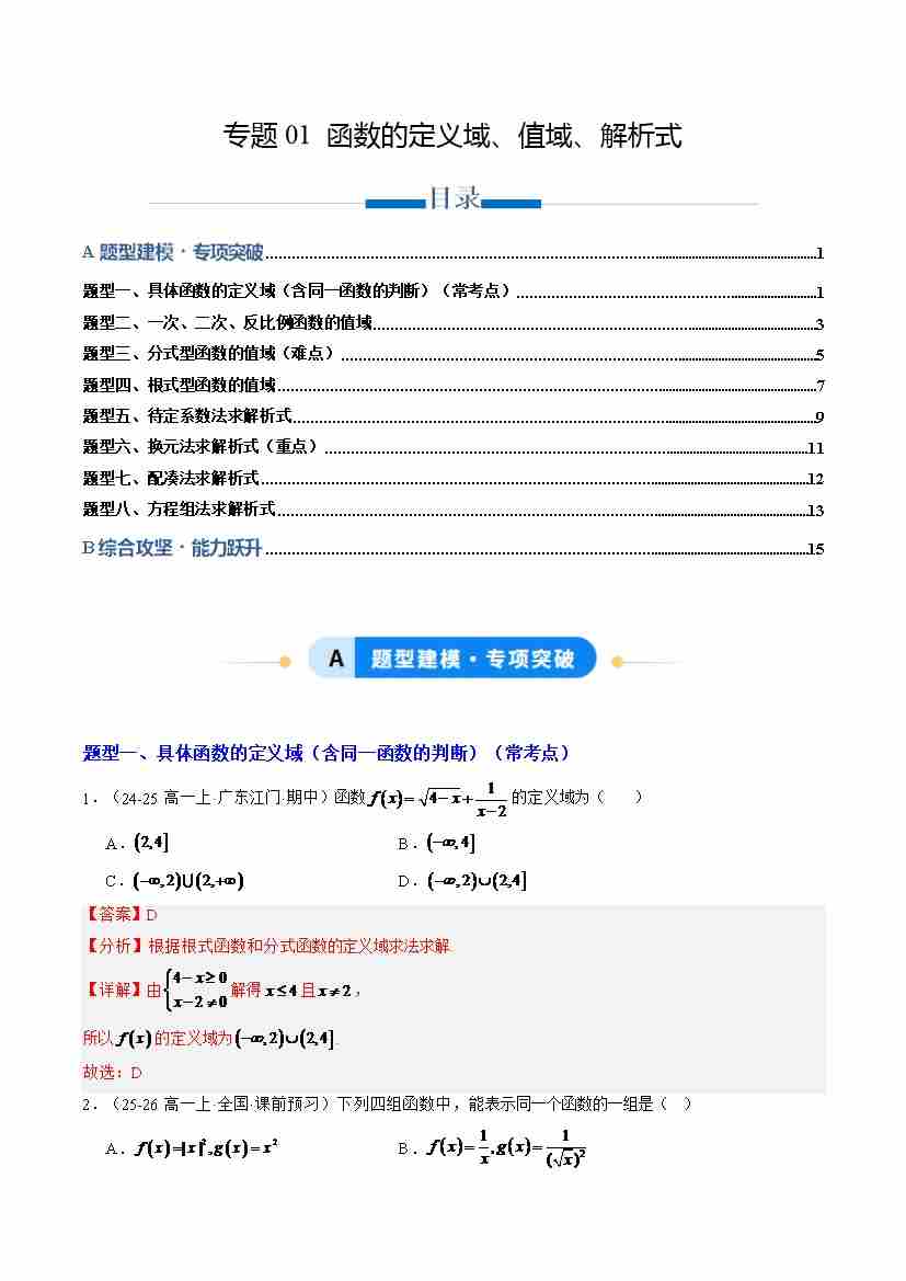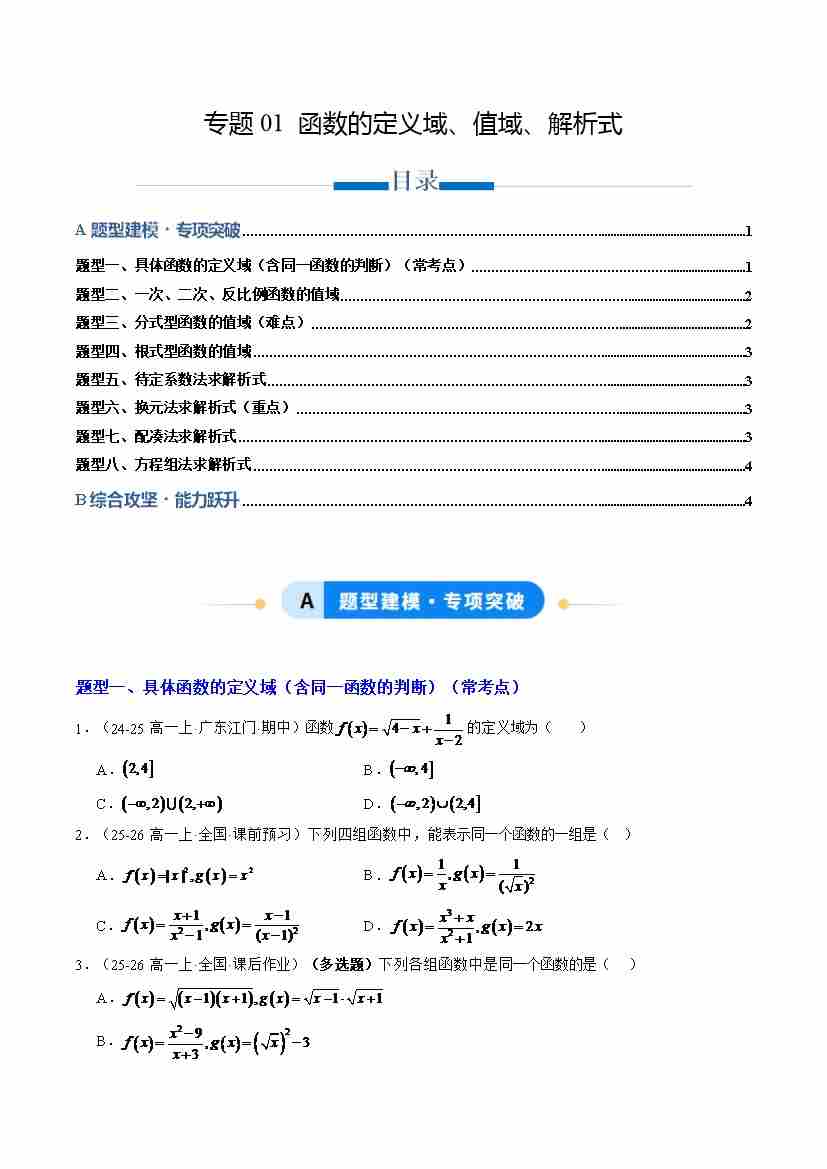 专题01 函数的定义域、值域、解析式(专项训练8大重点题型)(学生版)