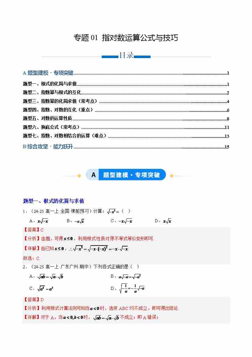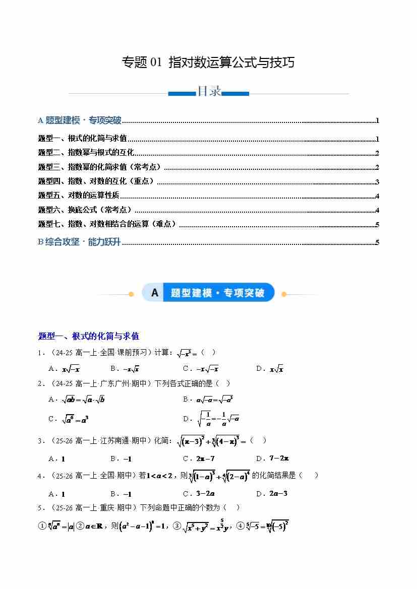 专题01 指对数运算公式与技巧(专项训练7大重点题型)(学生版)