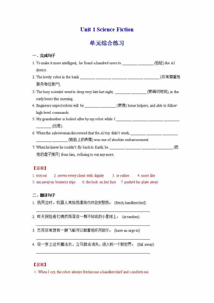 Unit 1 Science Fiction 单元综合练习 (原卷版)- (人教版2019选择性必修第四册)
