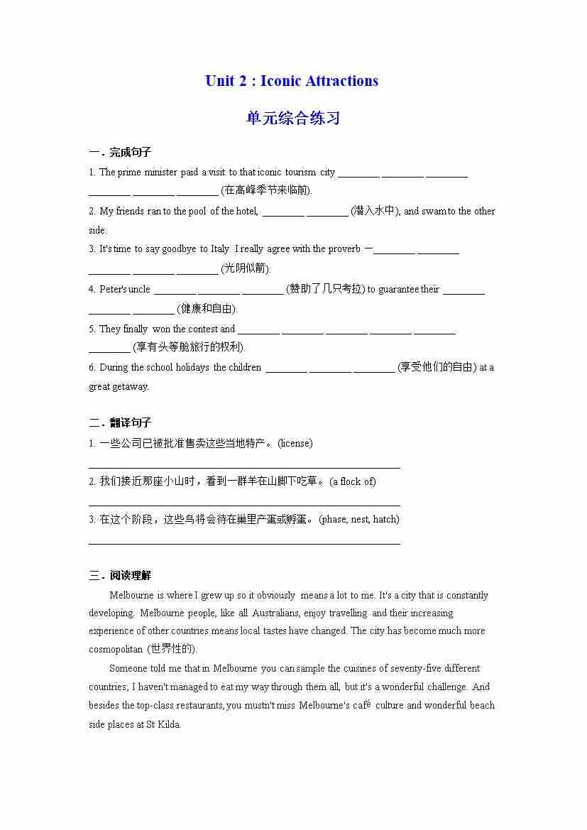 Unit 2 Iconic Attractions 单元综合练习 (原卷版)---(人教版2019选择性必修第四册)