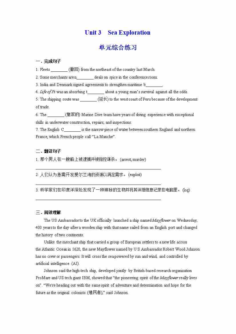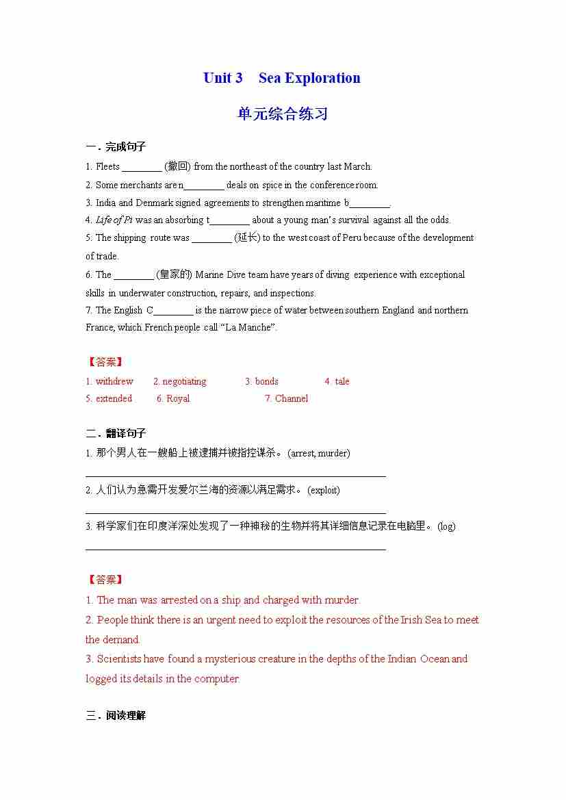Unit 3 Sea Exploration 单元综合练习 (原卷版)---(人教版2019选择性必修第四册)