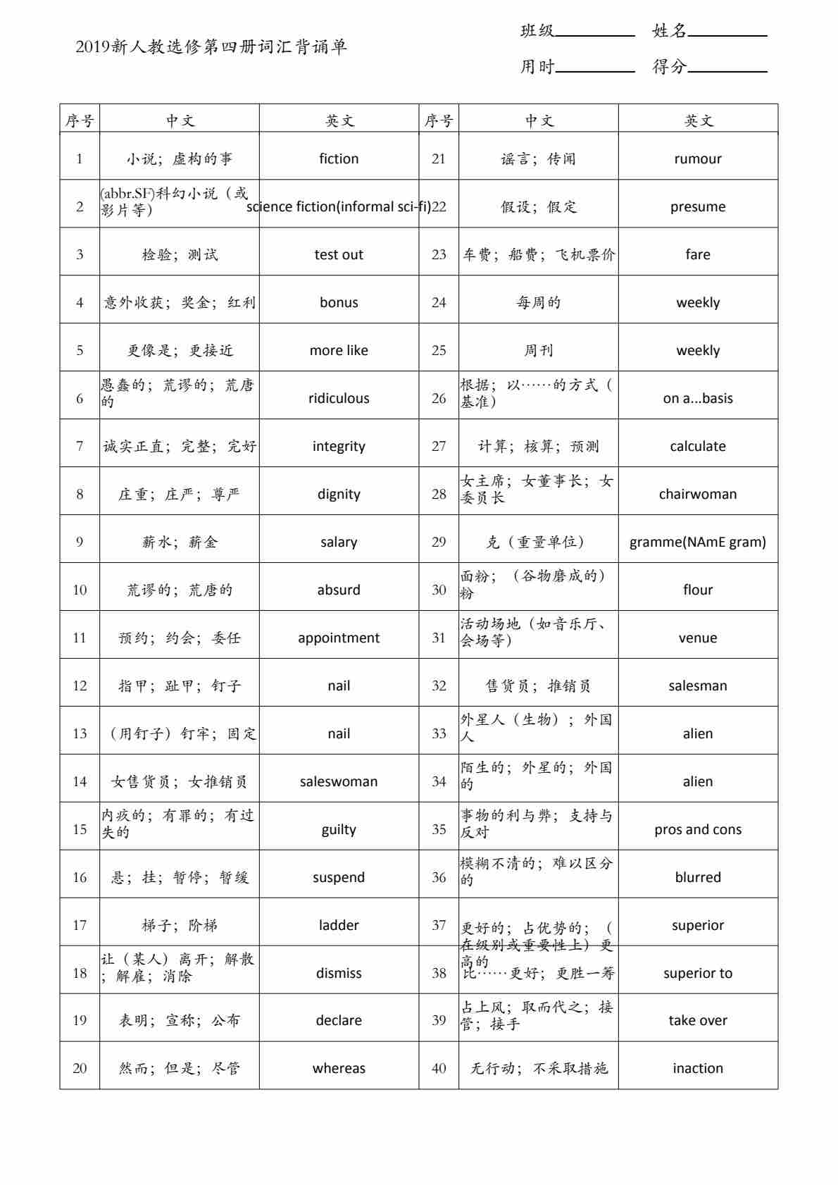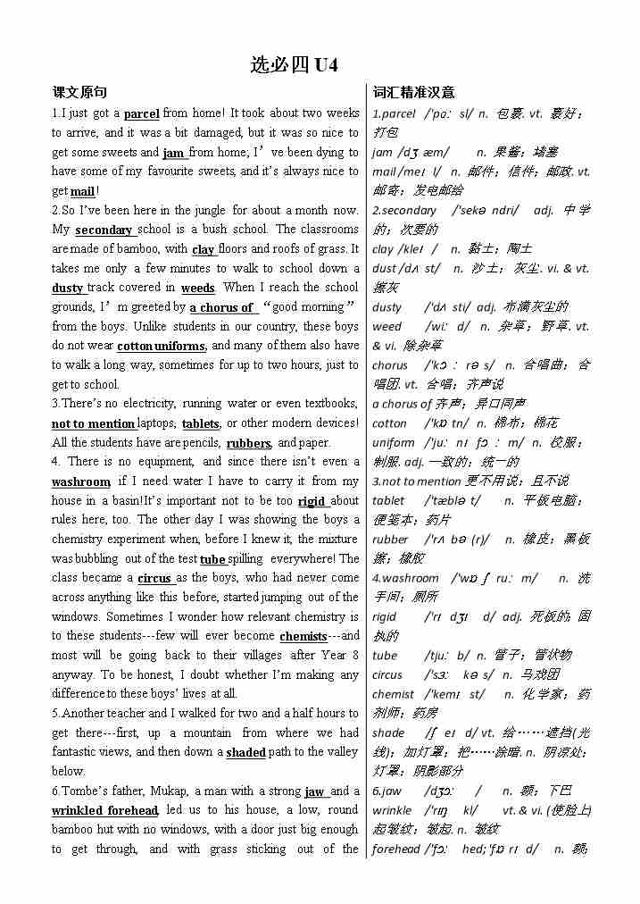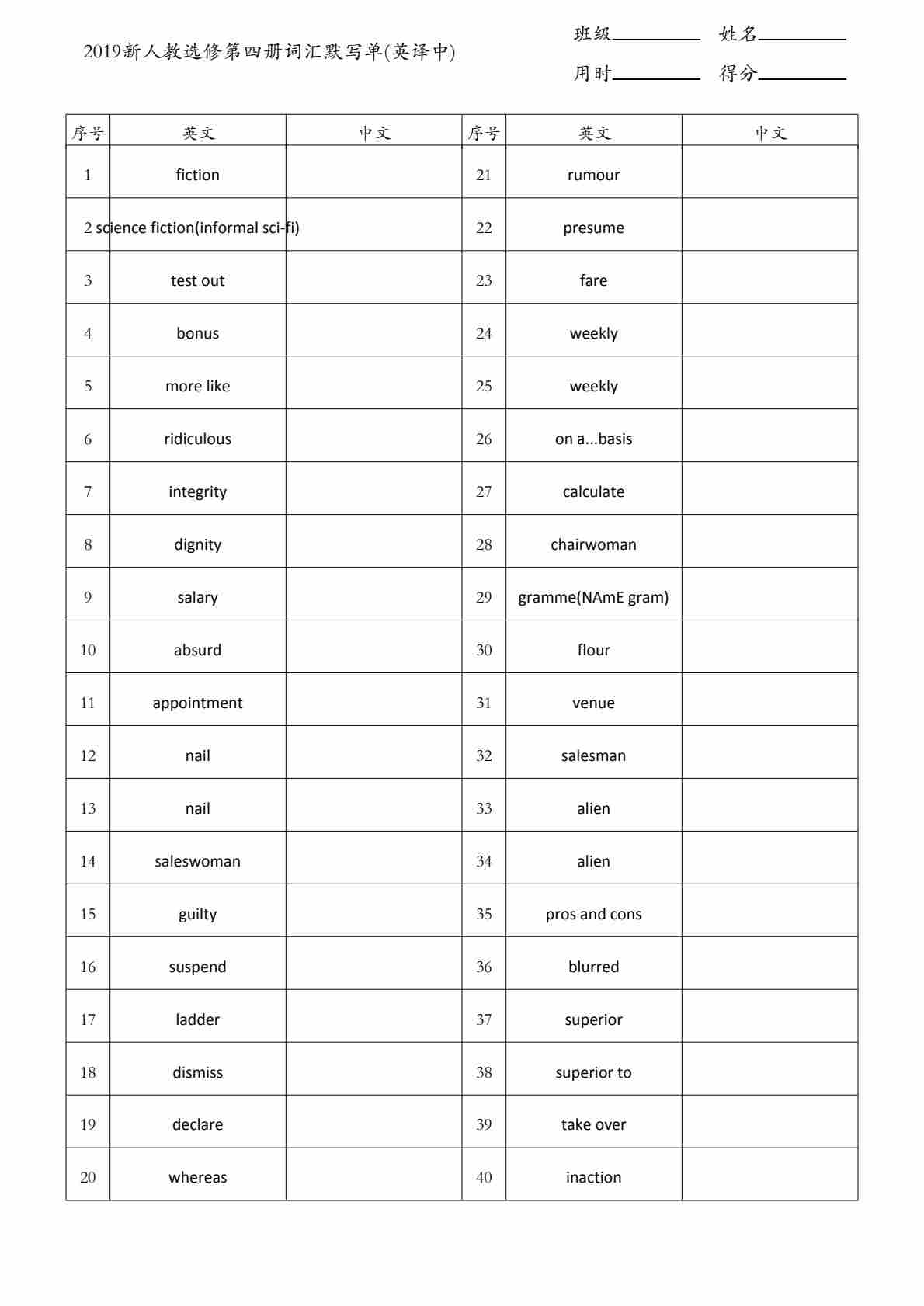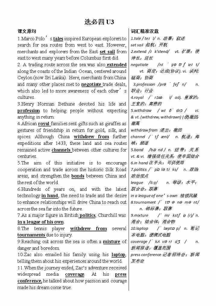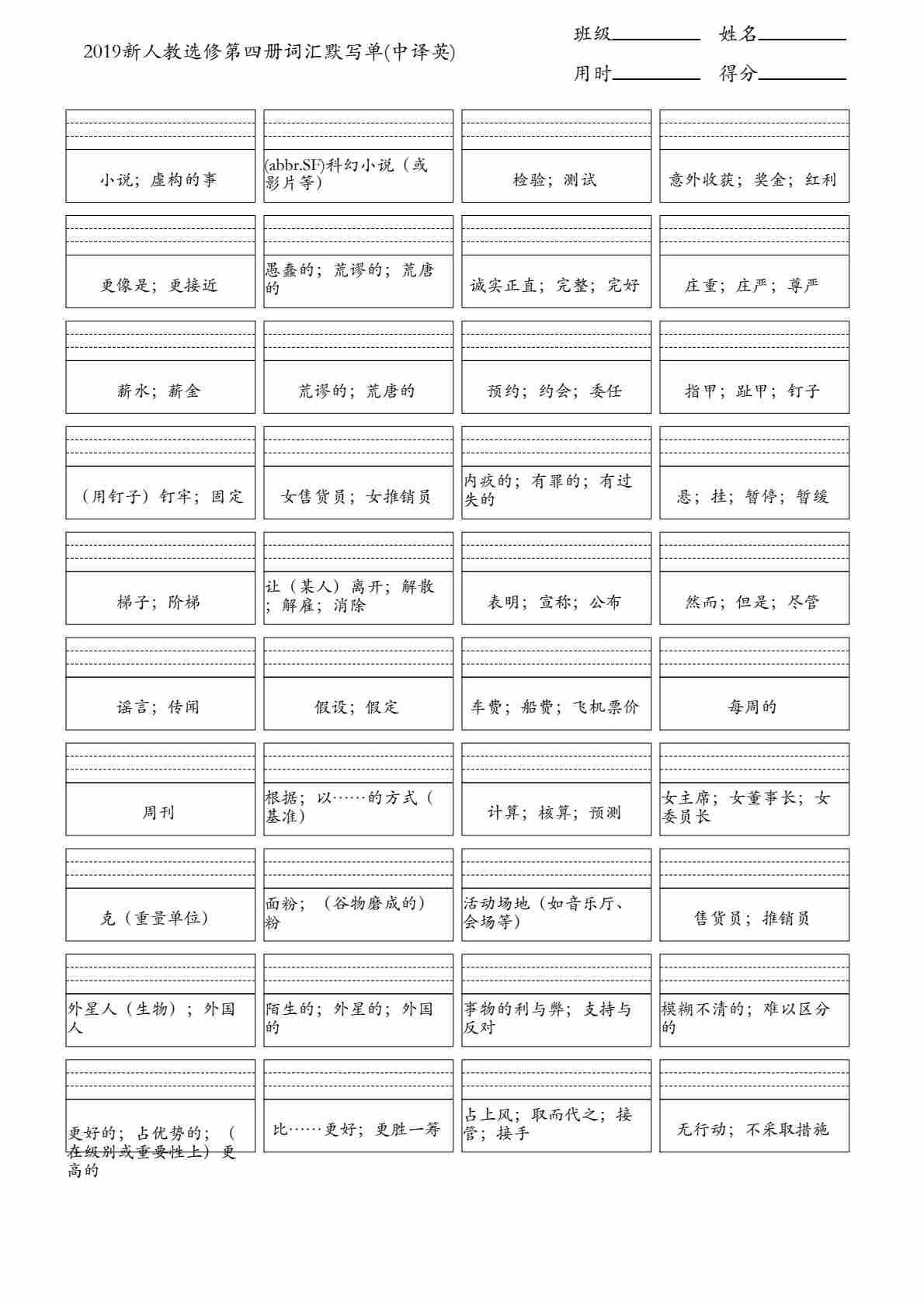 人教选修第四册词汇默写单(英译中)