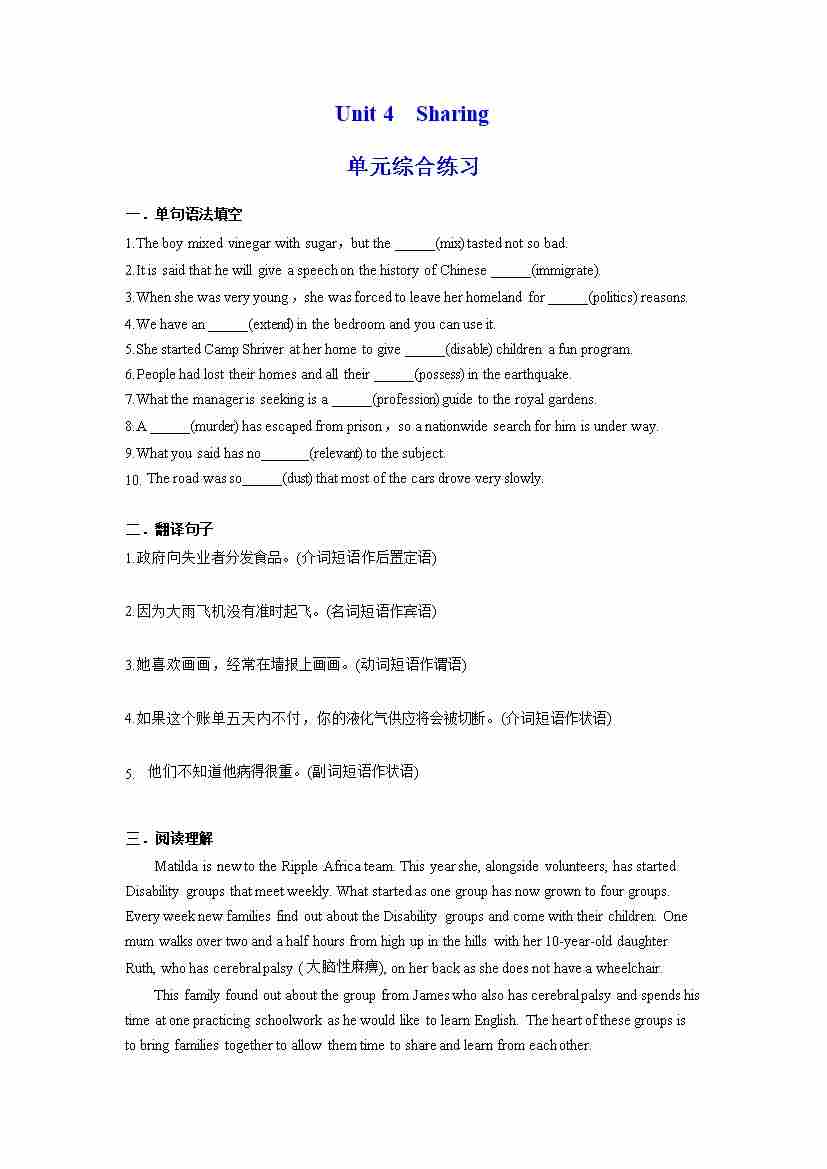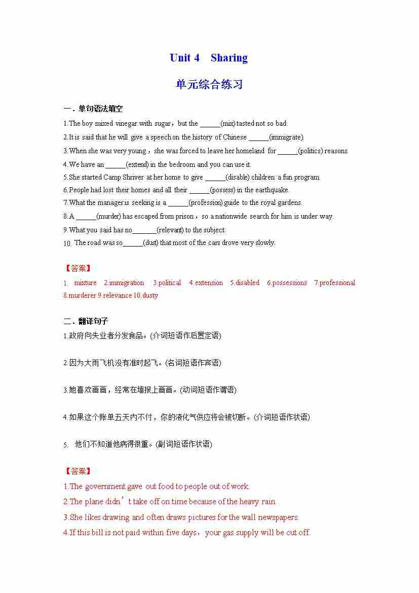 Unit 4 Sharing 单元综合练习 (解析版)---(人教版2019选择性必修第四册)