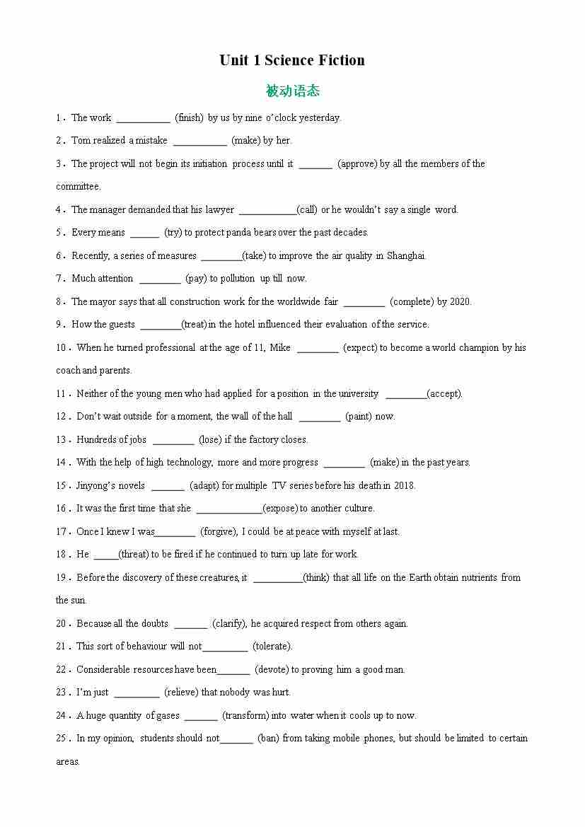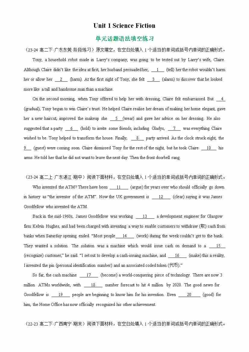Unit 1 Science Fiction 单元话题语法填空练习-(人教版2019)