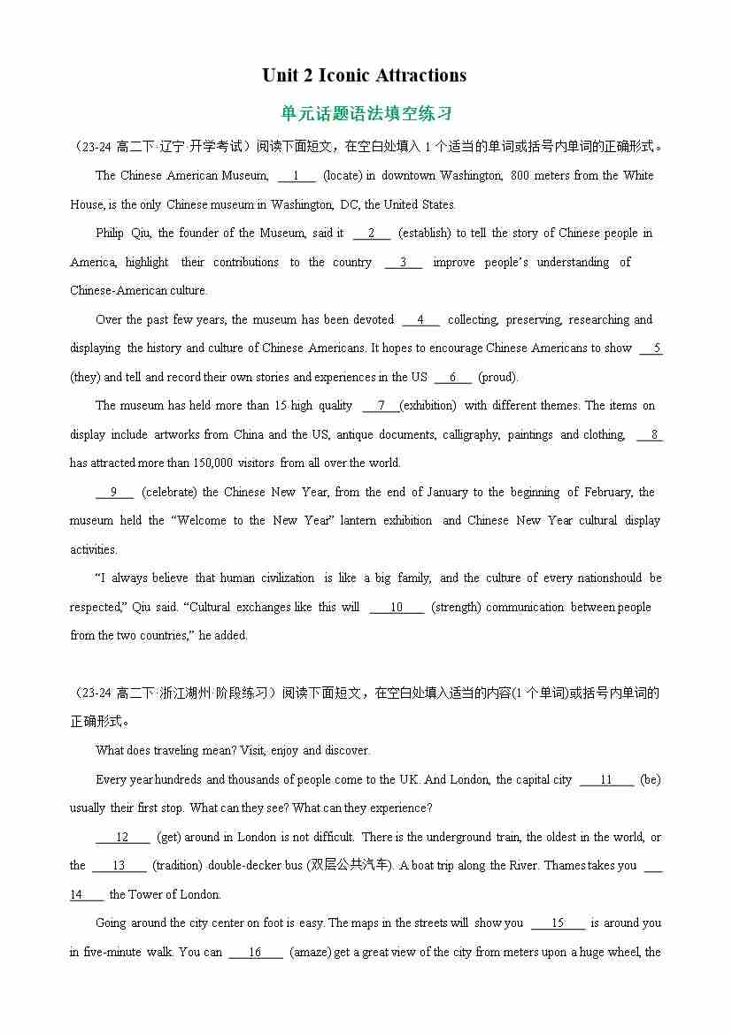 Unit 2 Iconic Attractions 单元话题语法填空练习-(人教版2019)