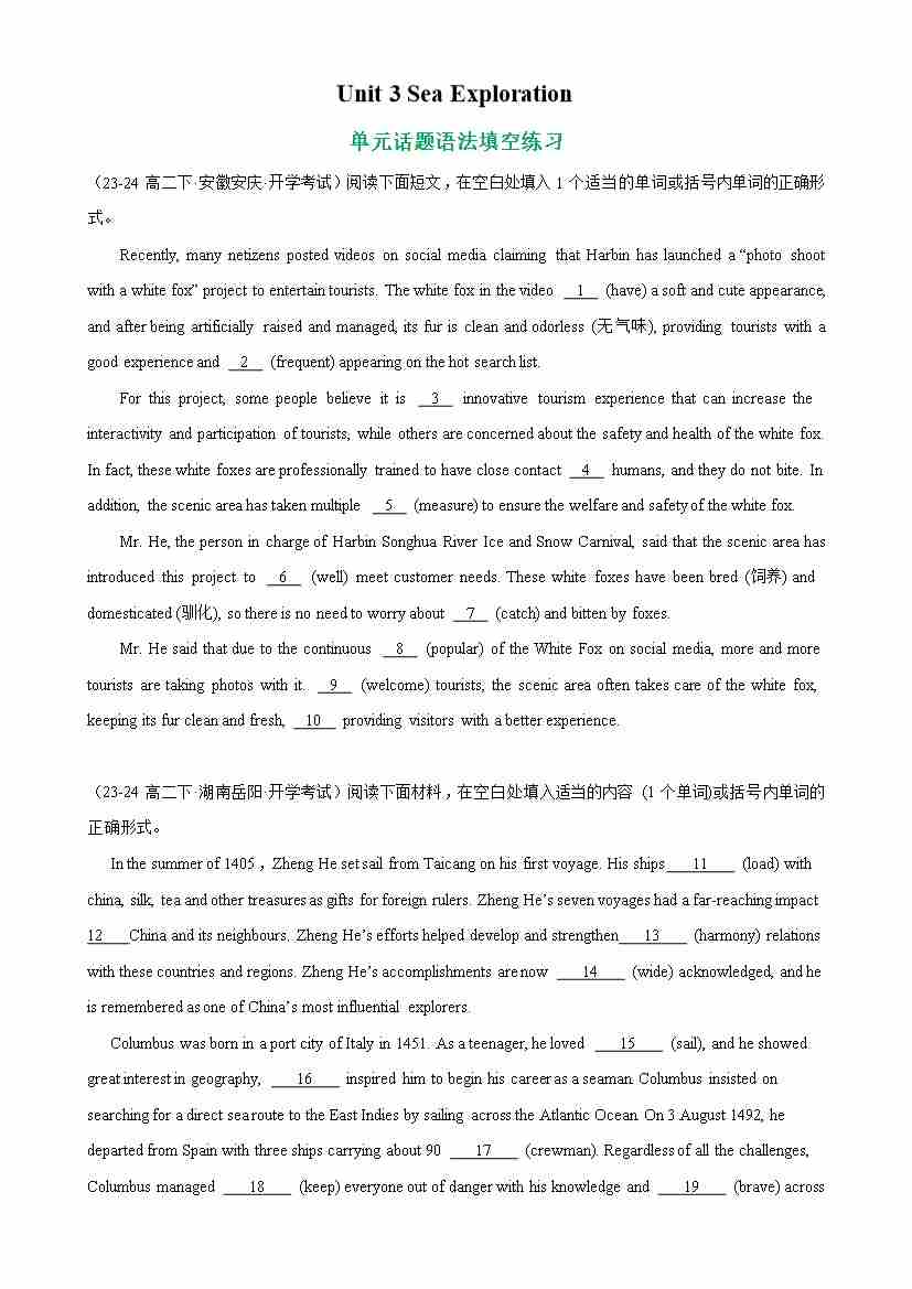 Unit 3 Sea Exploration 单元话题语法填空练习-(人教版2019)