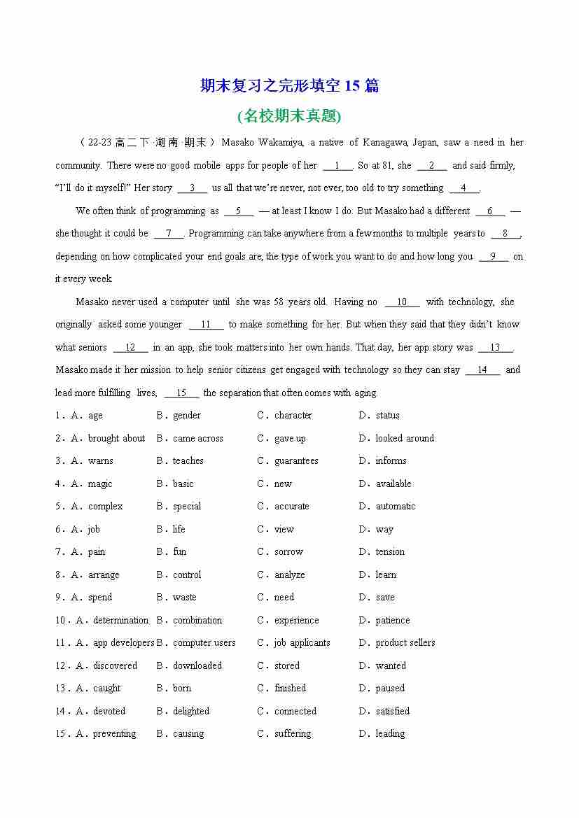 期末复习之完形填空15篇(名校期末真题)-(人教版2019)
