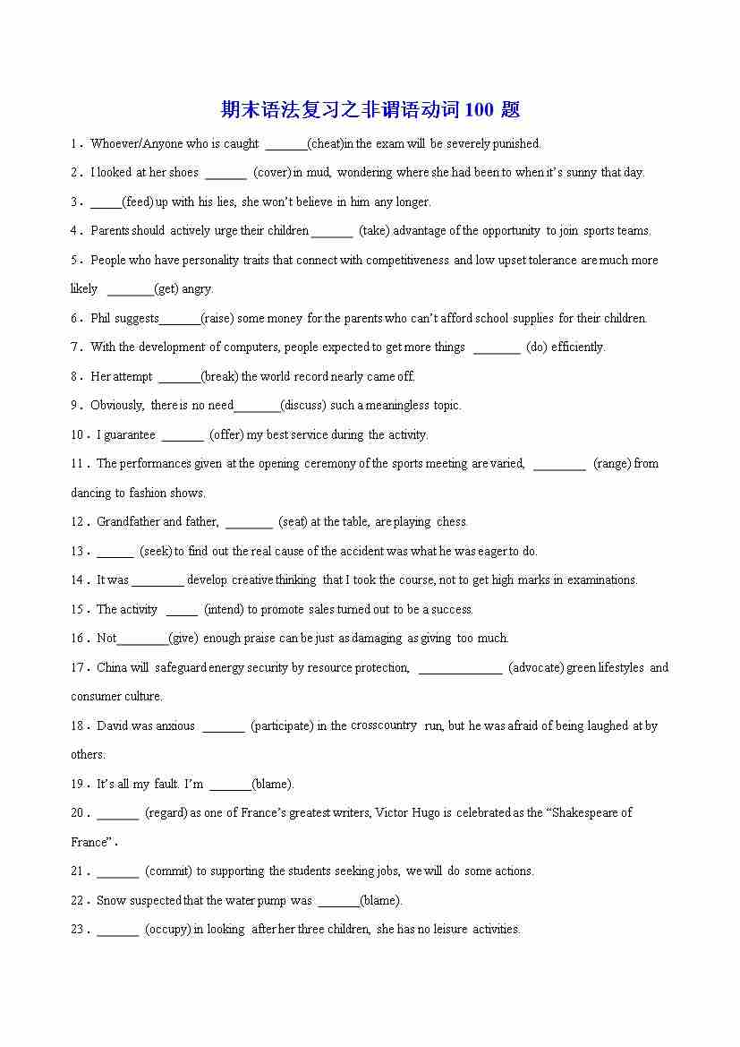 期末语法复习之非谓语动词100题-(人教版2019)