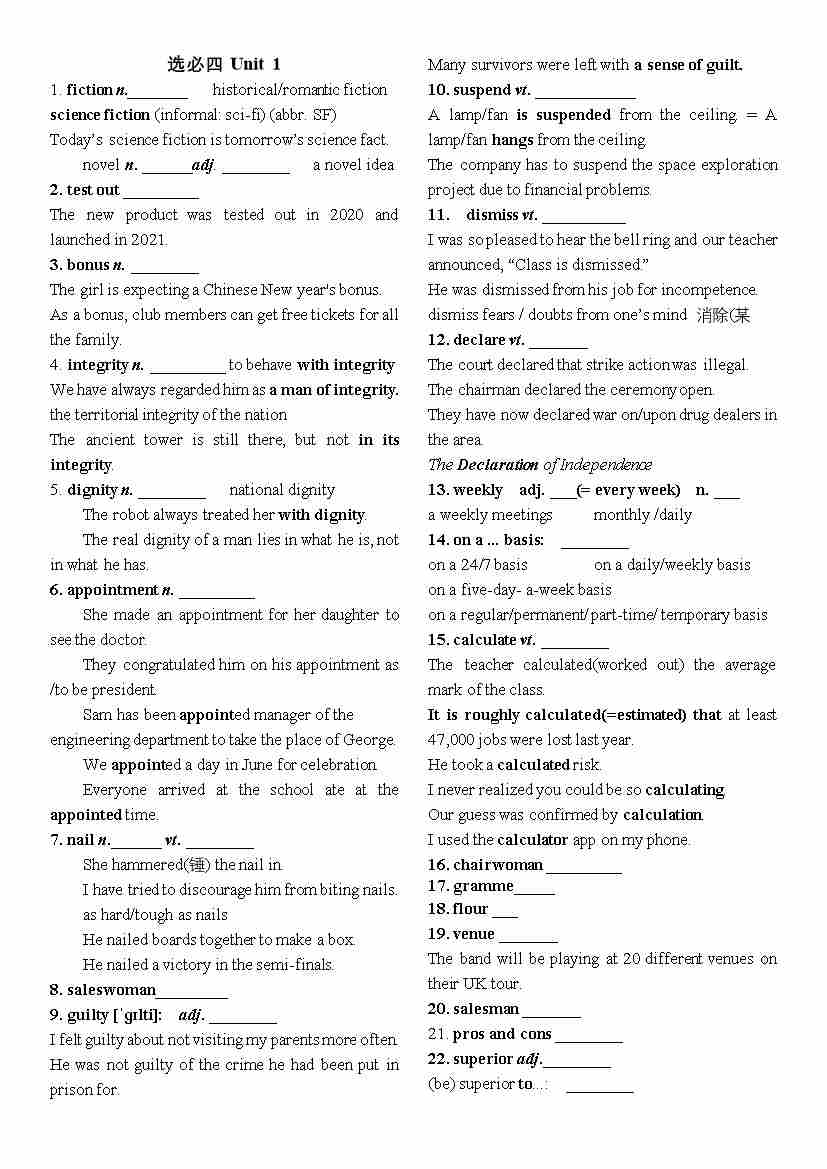 Unit 1课标单词汉译英(带例句) 讲义高中英语人教版选择性必修第四册
