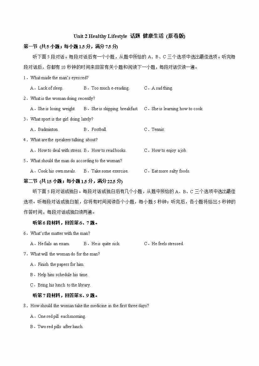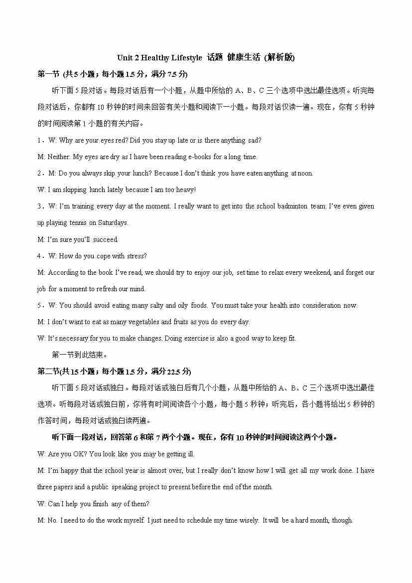 Unit 2 Healthy Lifestyle 话题 健康生活 (教师版)