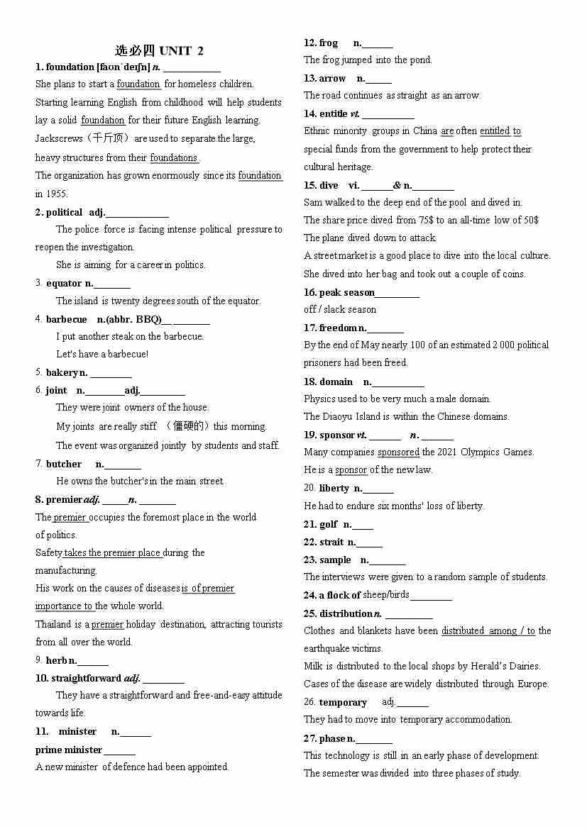 Unit 2课标单词汉译英(带例句) 讲义高中英语人教版选择性必修第四册