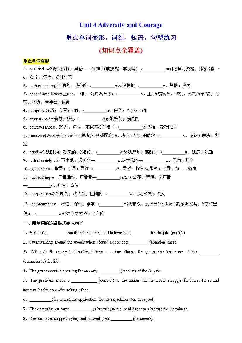 Unit 4 Adversity and Courage单词变形,词组,短语,句型练习-(人教版)