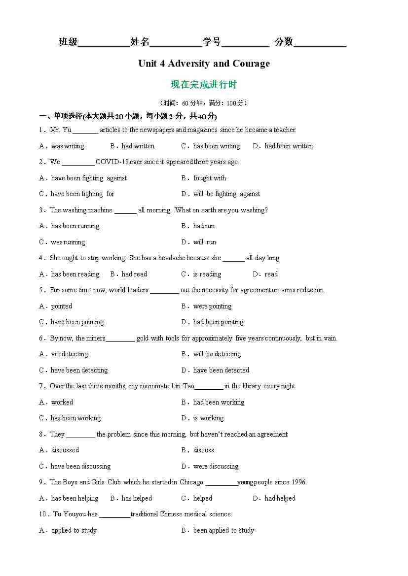 Unit 4 Grammar重点语法 现在完成进行时-(人教版)