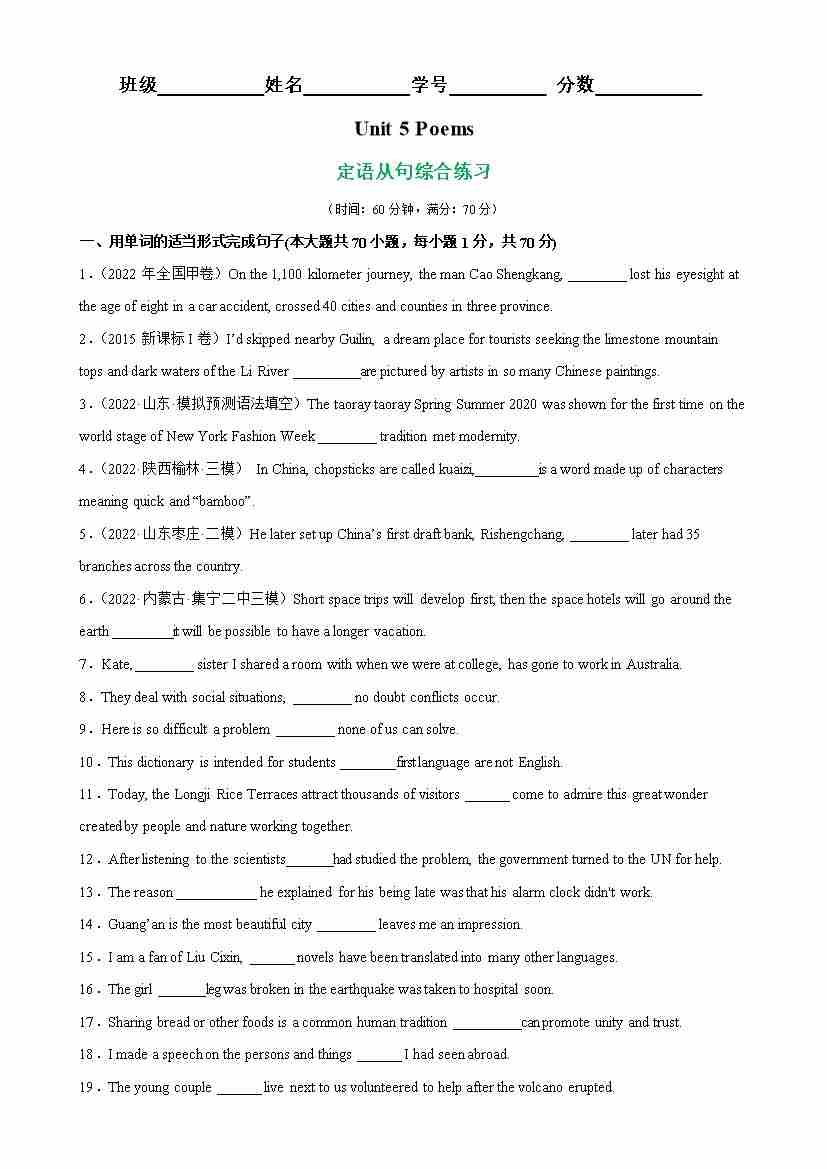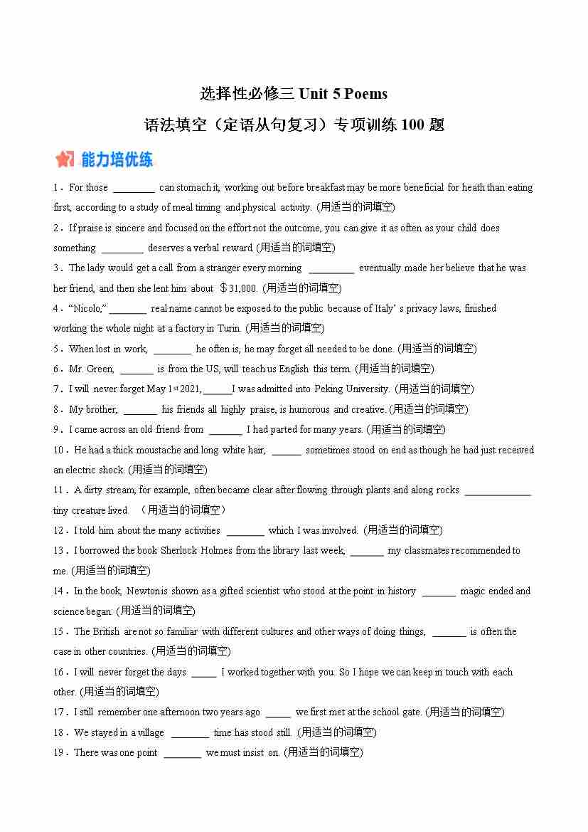 Unit 5 Poems:语法填空(定语从句复习)专项训练100题(学生版)-(人教版选择性必修第三册)